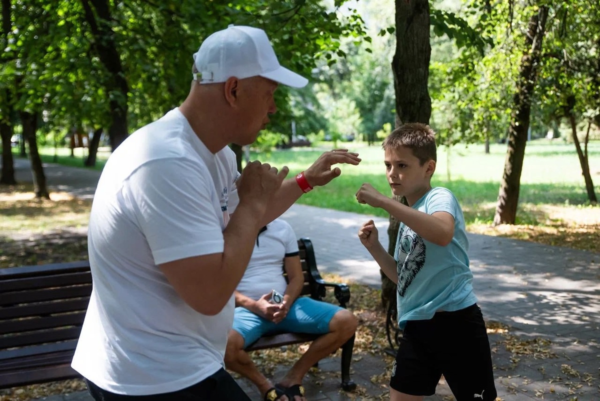 Мастер спорта по боксу Евгений Воробьев проводит тренировку для курян 🥊 «Поднимаем спортивный дух», — так говорит мастер спорта по боксу Евгений Воробьев, один из наставников проекта «Народный тренер», старт которому 5 июля дал врио губернатора Александр Хинштейн. ✔️ В рамках «Народного тренера» в Курске проводятся бесплатные занятия по двум десяткам видам спорта — от футбола и волейбола до йоги и скалолазания. Всего в городе действуют 25 площадок. 💪 Евгений Воробьев три раза в неделю тренирует в парке Героев Гражданской войны. Сегодня на занятии больше 10 человек — все разного возраста, есть и малыши, и взрослые. Выполняют упражнения для общефизической подготовки, но с элементами бокса. Начинают с разминки, а затем дисциплинированно следуют заданиям тренера — бегают, прыгают через скакалку, ведут «бой с тенью», отрабатывают уклоны, ответные серии ударов. Судя по эмоциям, ребятам нравится. 👦🏻 Антон Седых на тренировку пришел впервые. Раньше занимался плаванием, сейчас хочет поп
