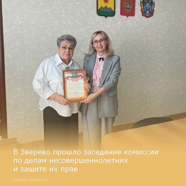 Заместитель главы администрации по социальным вопросам города Зверево Ирина Крюкова провела заседание комиссии по делам несовершеннолетних, на котором подвели итоги работы наставников за первое полугодие. Благодарственных писем городской администрации удостоены: заведующий педиатрическим отделением поликлиники центральной больницы Татьяна Бугрименко, председатель местного отделения Всероссийской общественной организации «Союз женщин России», начальник отдела образования Евгения Ташматова, завуч по воспитательной работе торгово-промышленного техникума имени Ермина Любовь Ивина. Заседание продолжилось рассмотрением вопросов, посвященных профилактике самовольных уходов несовершеннолетних из дома и государственных учреждений и другим темам. Напомним, ранее сообщалось о том, что в Зверево дети из малообеспеченных семей, дети участников специальной военной операции, а также юные зверевчане из замещающих семей и находящиеся в социально опасном положении, отправились на летний отдых,