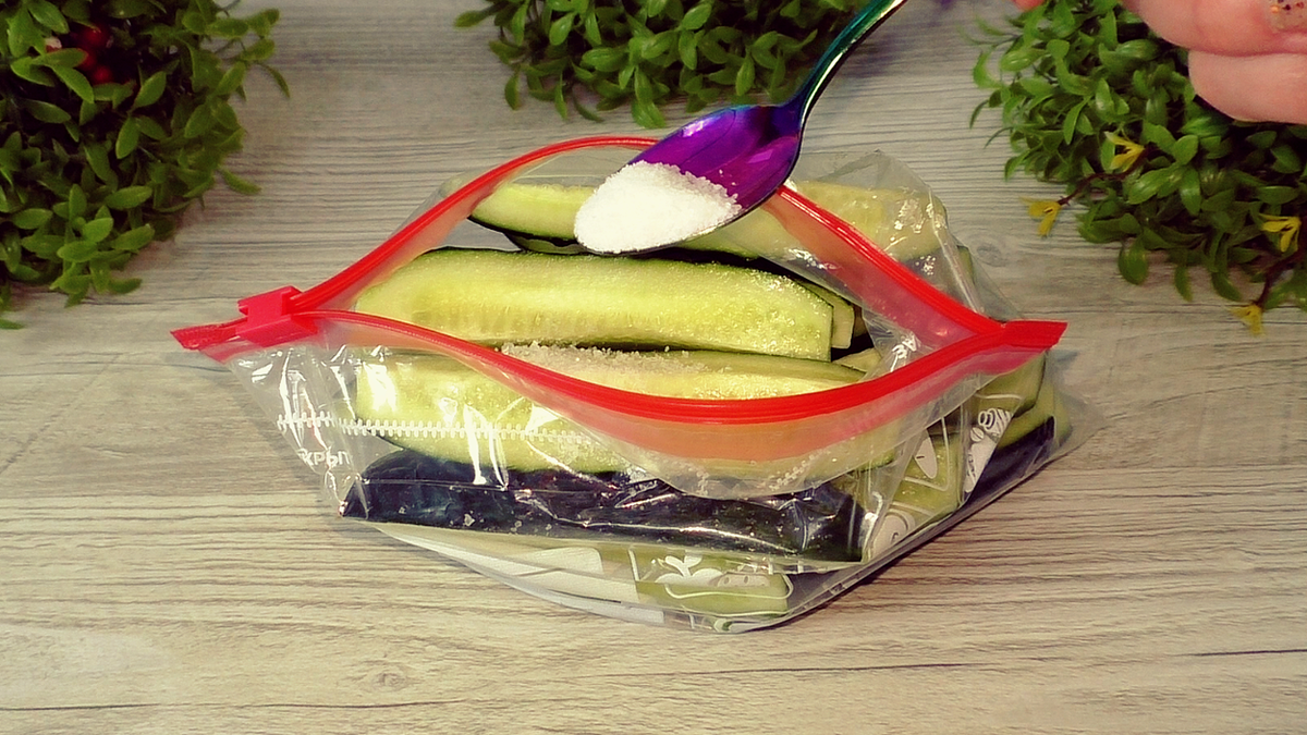 Переложить огурцы в пакет. Можно использовать любой, главное — достаточно плотный, чтобы не порвался.