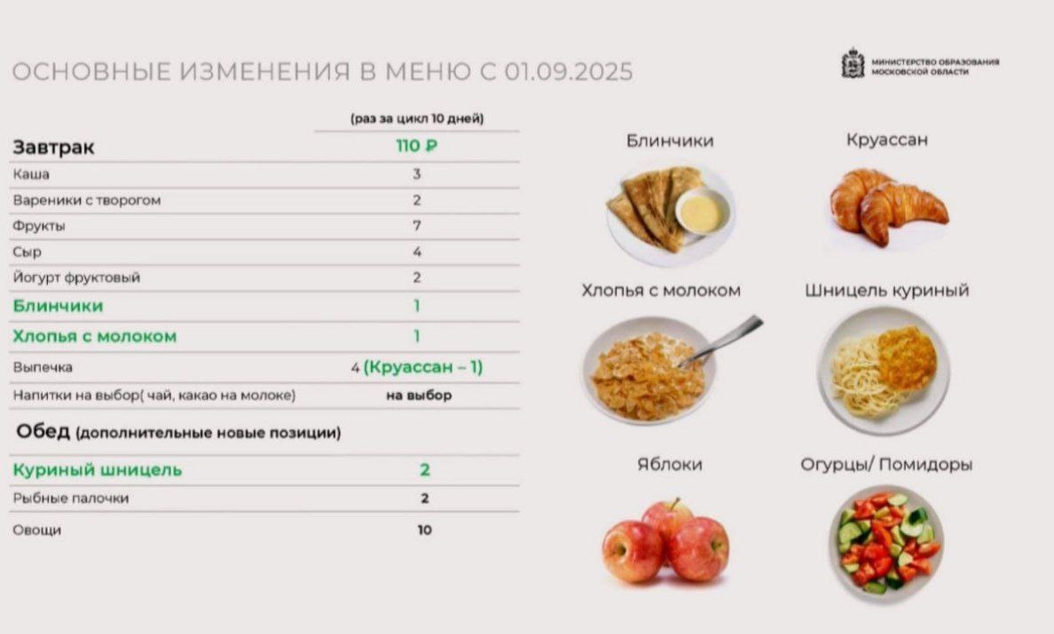 С 1 сентября 2025 года в школьных столовых Подмосковья появятся новые позиции на завтрак и обед. Среди нововведений — блинчики, хлопья с молоком, круассаны и куриный шницель. Министр образования отметила, что изменения коснутся рациона питания учащихся всех образовательных учреждений области. Но пока даже до питания в московских больницах далеко, там уже год подают красную рыбу с блинами, сырники, ризотто и фриттату😜