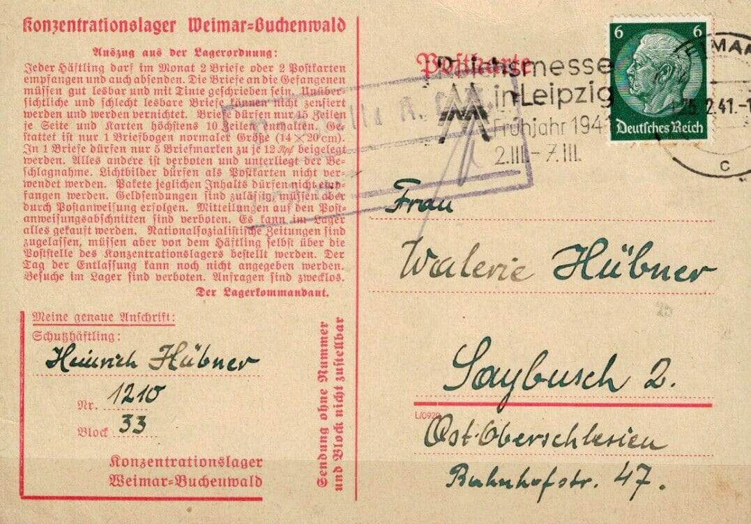 15 июля 1937 года открыт концентрационный лагерь Бухенвальд – один из крупнейших концентрационных лагерей на территории Германии, располагавшийся близ города Веймар в Тюрингии. Письмо от узника Бухенвальда №1210 Ш. от 25 февраля 1941 года в Сайбуш (Верхняя Селезия) Бухенвальд (нем. Buchenwald – «буковый лес») первоначально назывался Эттерсберг. С июля 1937 по апрель 1945 года через лагерь прошло около 250 тысяч заключённых. Бухенвальд имел 138 концлагерей-филиалов, наиболее крупные из которых были на территории Германии – это Дора (близ Нордхаузена), Лаура (под Заальфельдом) и Ордруф (в Тюрингии). Заключенных эксплуатировали и владельцы крупных промышленных фирм, чьи предприятия были расположены в районе Бухенвальда (Сименс, Юнкерс). В концлагерях Бухенвальд, Заксенхаузен, Нойенгамме, Равенсбрюк были созданы оружейные фабрики. Особенно много заключенных погибло в филиале Бухенвальда – Дора-Миттельбау (близ Нордхаузена), где в подземных цехах изготовлялись самолёты-снаряды Фау-1 и Фау-2