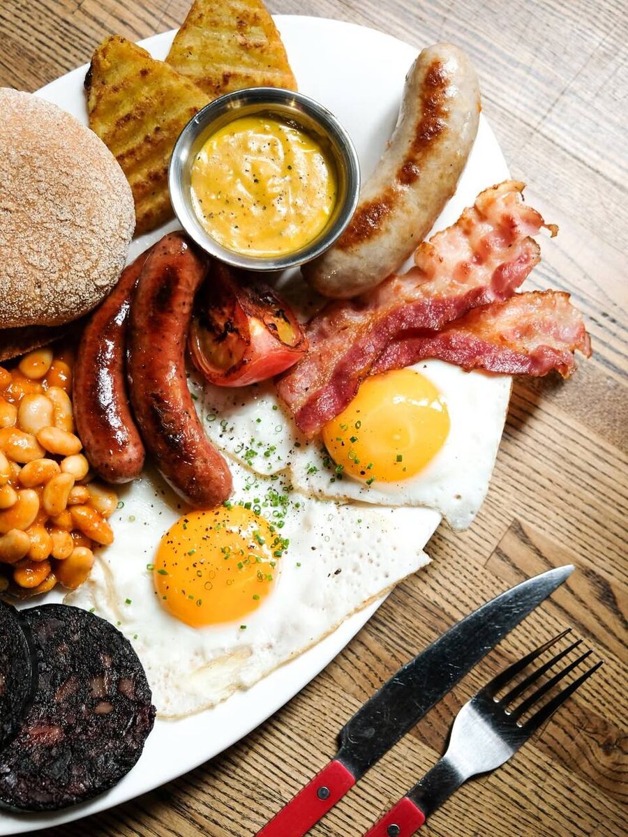 Английский завтрак с булочкой-маффином, жареным беконом, свиной колбаской, двумя мини-сосисками, кровяной колбасой, хашбрауном, яичницей, фасолью в томатном соусе, карривурстом, томатами-гриль и горчичным соусом.