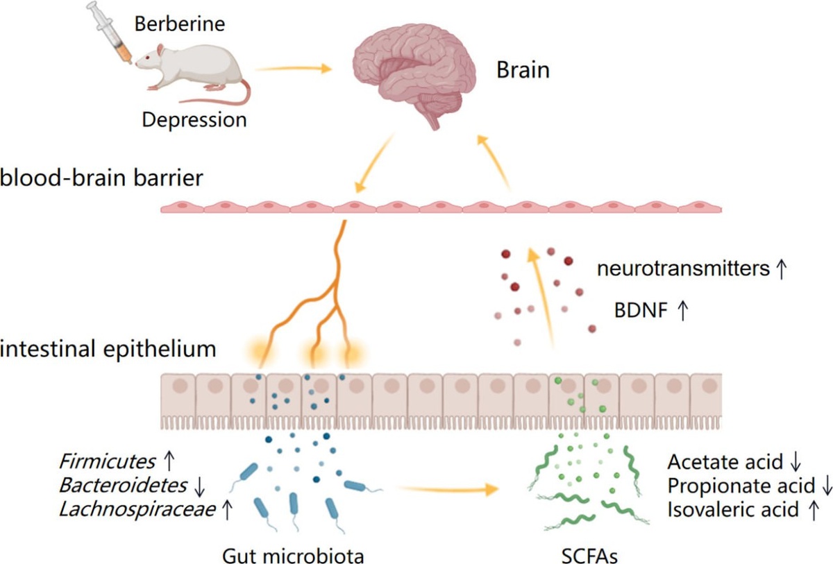 Кишечная микробиота обеспечивает двустороннюю коммуникацию между центральной нервной системой и кишечником, известную как ось "микробиота-кишечник-мозг" (MGB). Эта ось играет ключевую роль в патогенезе депрессии. Нарушение состава кишечной микробиоты приводит к дисфункции кишечного барьера, что активирует системное воспаление, изменяет уровни моноаминовых нейротрансмиттеров, влияет на активность гипоталамо-гипофизарно-надпочечниковой системы и экспрессию нейротрофического фактора мозга (BDNF). Метаболиты кишечной микробиоты, такие как короткоцепочечные жирные кислоты (КЦЖК), играют важную роль в межсистемной коммуникации. КЦЖК, включая уксусную, пропионовую и масляную кислоты, проникают через гематоэнцефалический барьер и оказывают прямое воздействие на мозг. Они влияют на целостность гематоэнцефалического барьера, нейротрансмиссию, нейротрофические процессы и биосинтез серотонина. Исследования показали, что микробиота кишечника модулирует серотониновую сигнализацию через рецептор 5-