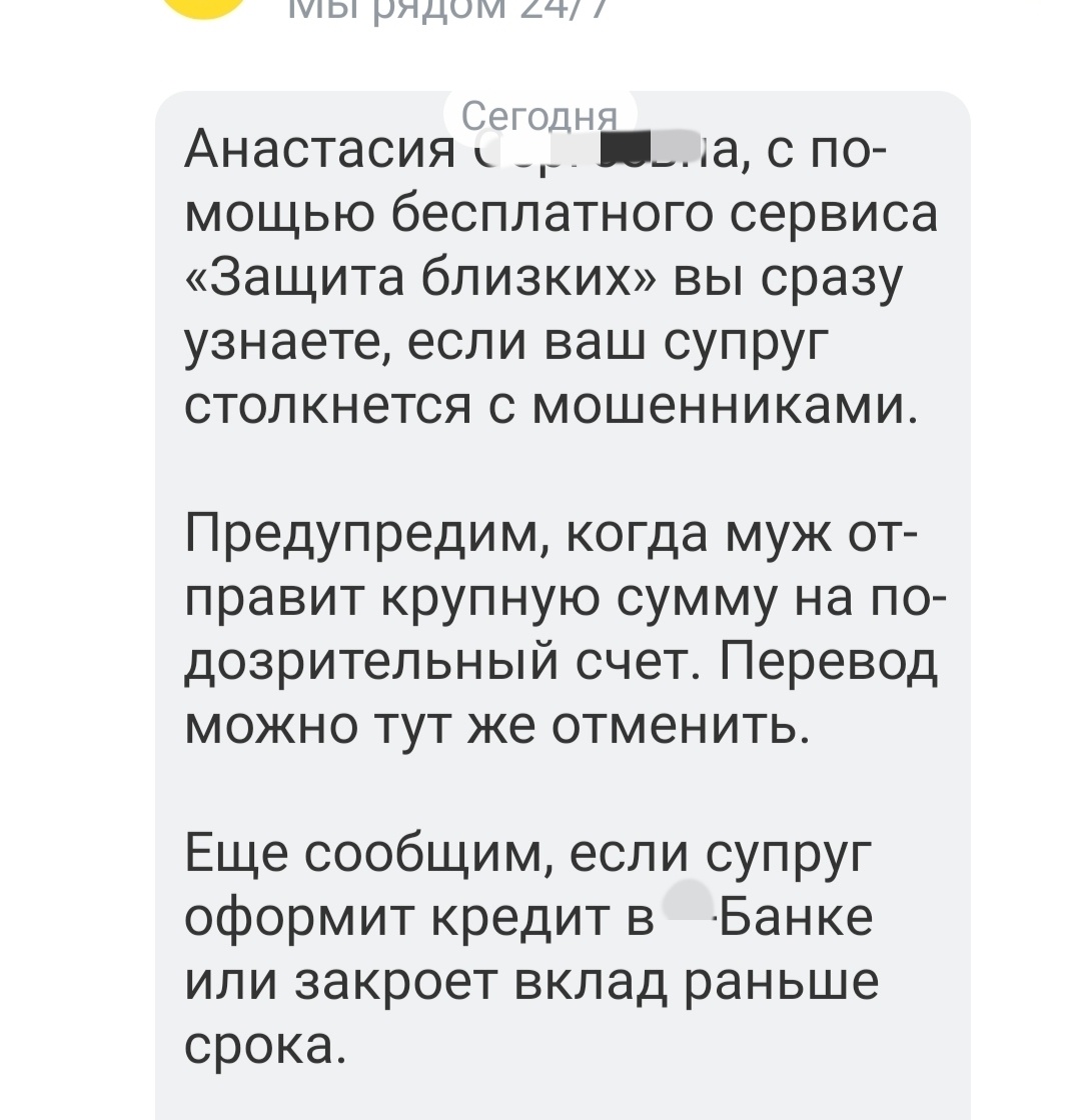 Всем привет! Да, именно такое ощущение у меня возникло, когда я вчера получила предложение от банка на букву "Т". Конечно, можно не только мужа/жену подключить к сервису, но и пожилых родителей, при условии, что они тоже являются клиентами этого банка. Ощущения у меня странные. С одной стороны, как будто ты не доверяешь своему супругу, сомневаешься в его адекватности. С другой стороны, после истории, что случилась у блогера, на которого я подписана, стоит задуматься - а может и нужна такая функция. У блогера муж взял в кредит очень большую сумму, и перевел ее мошенникам. При этом он сам утверждает, что нет, это не мошенники, он только хотел помочь человеку, который оказался в трудной жизненной ситуации. И может, если бы такая функция у них была подключена, удалось бы вовремя остановить мужа. Самое интересное, что моему мужу, который также является клиентом этого банка, такого предложения не присылали. Напишите в комментариях - подключили бы такой сервис для близких или нет?