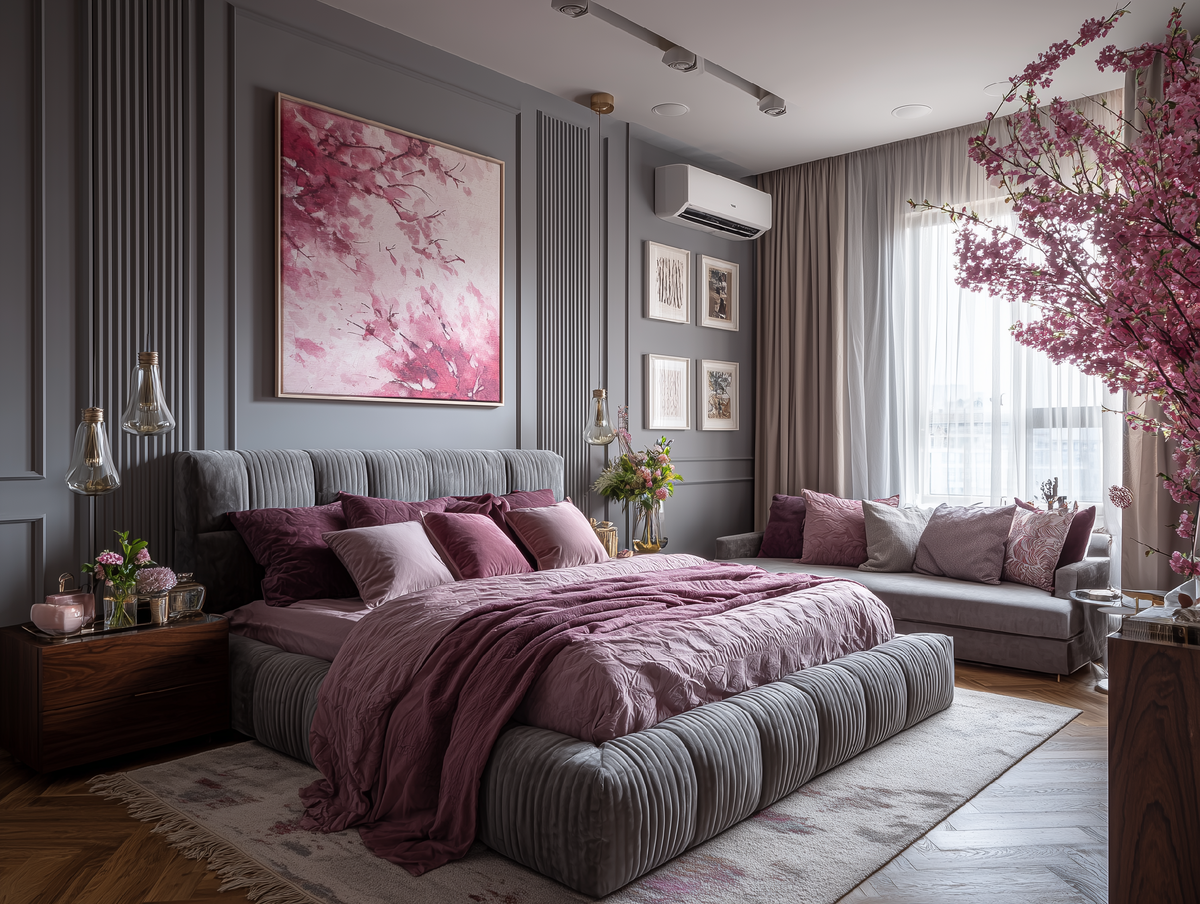 Фото 1: Современная спальня с атмосферой японского уюта и глубокой палитрой Этот интерьер поражает балансом между утончённой строгостью и мягкой романтичностью. Акцентная стена, выкрашенная в благородный графит, подчеркнута ритмичными вертикальными панелями и декорирована абстрактной картиной в насыщенных оттенках фуксии. Глубокие винные и розовые акценты в текстиле контрастируют с фактурной серой обивкой кровати, создавая эффектный и уютный ансамбль. 🧺 Организуй пространство со вкусом — 4 выкатных ящика в разных цветах и ценах на выбор! Мягкое рассеянное освещение, встроенное в потолок и усиленное стеклянными подвесами по бокам кровати, формирует тёплую, камерную атмосферу. У окна — лаунж-зона с диваном и множеством подушек, идеально подходящая для расслабленного чтения. Цветущие ветви сакуры в углу комнаты завершают восточный мотив, добавляя интерьеру свежести и характера. Фото 2: Неоклассика в светлом исполнении с мрамором и пудровыми акцентами Эта спальня — образец современного пр