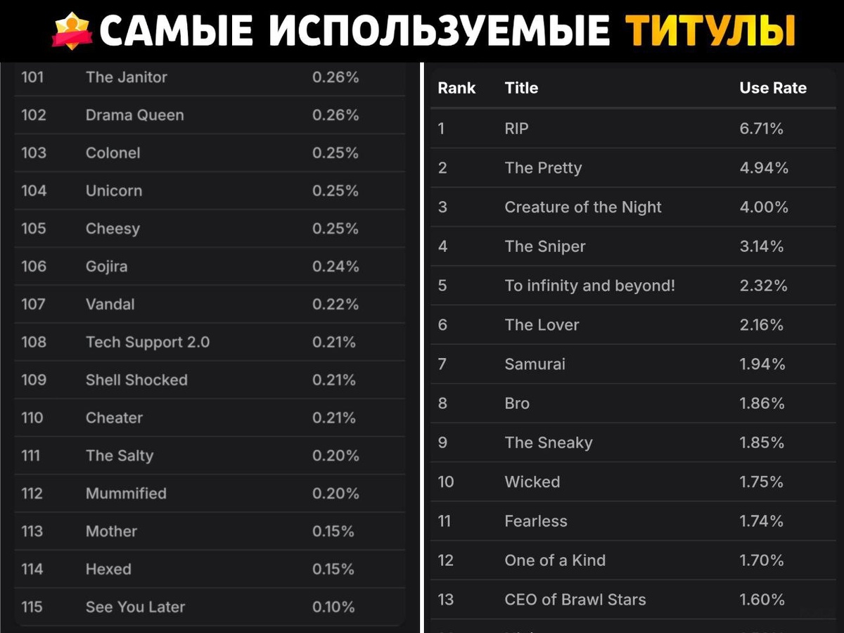 👤 А что по титулам? На данный момент в игре самыми популярными являются титулы «Помянем», «Красавчик» и «Порождение Ночи» (кто бы сомневался). А вот самыми малоиспользуемыми стали титулы на Еву, ДжуДжу и Алли Какой у вас самый любимый титул? 🤔 ✅Новости по Clash Royale - ТЫК Мир Supercell. Подписаться