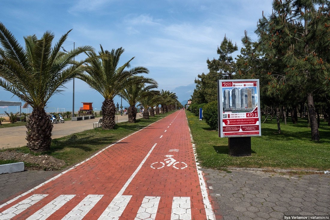 16. Так как Батуми — европейский город, в нем сделано много велодорожек. Но почти все они спроектированы неграмотно. Например, иногда их просто рисуют посередине тротуаров. Вообще совмещать велодорожки с тротуаром нельзя. Велоинфраструктуру нужно развивать параллельно пешеходной и автомобильно, а не в ущерб им. Тогда это будет эффективно и безопасно.