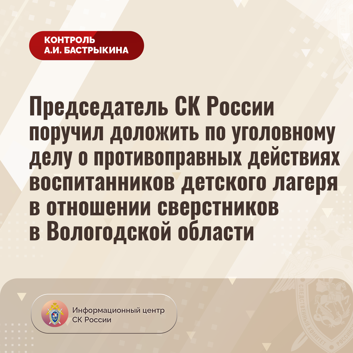Председатель СК России поручил доложить по уголовному делу о противоправных действиях воспитанников детского лагеря в отношении сверстников в Вологодской области В телеграм-канале сообщается, что в июле текущего года в Вологодской области несколько воспитанников одного из детских лагерей совершили противоправные действия в отношении восьмилетнего мальчика. Происходящее подростки фиксировали на камеру мобильного телефона, после чего разместили видеозапись в сети Интернет. Отмечается, что данный случай не единичный, ранее физическому насилию подвергались и другие дети. В СУ СК России по Вологодской области возбуждено уголовное дело. Председатель Следственного комитета Российской Федерации Александр Иванович Бастрыкин поручил руководителю СУ СК России по Вологодской области Геннадию Юрьевичу Яшину представить доклад об установленных в ходе первоначальных следственных действий обстоятельствах, а по завершении расследования – о его результатах. Исполнение поручения поставлено на контроль в