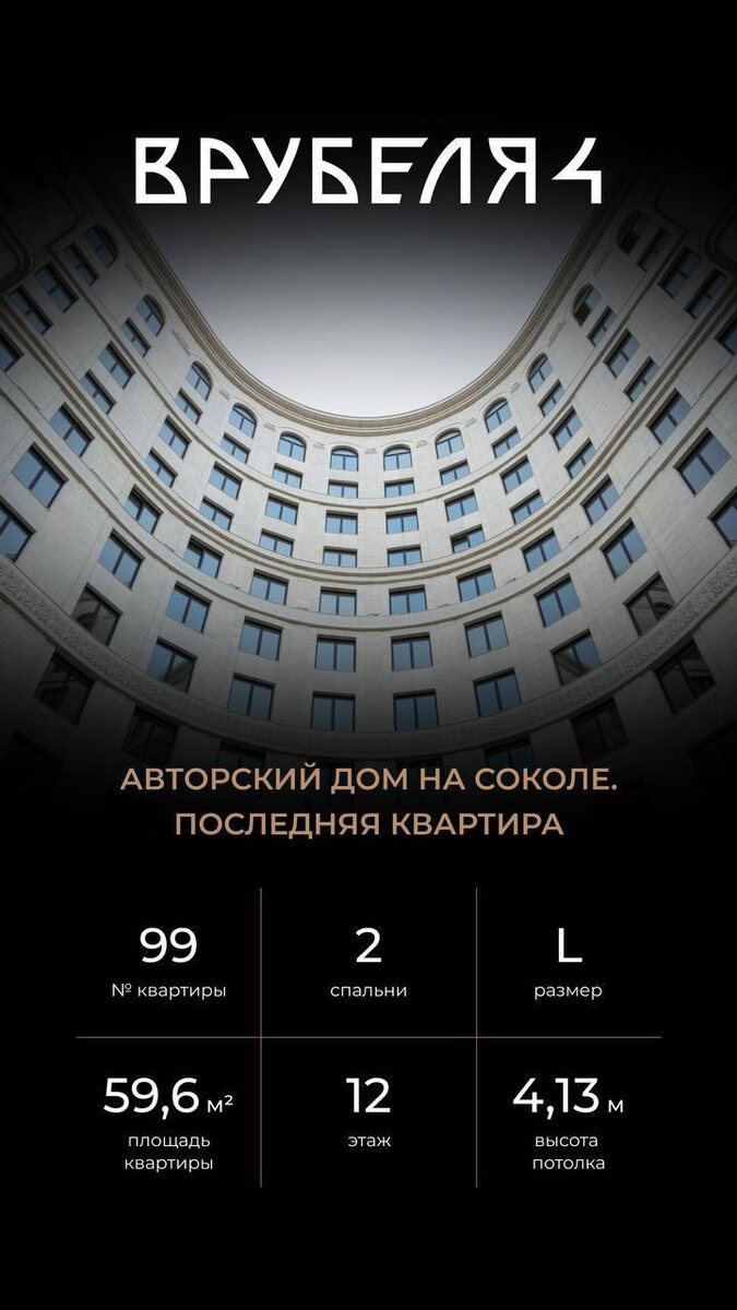 В доме «Врубеля 4» последняя квартира High Level Квартира N 99 для тех, кто ценит вечную классику в современной интерпретации. Планировка адаптируется под запрос клиента — на выбор 3 планировочных решения. • 59,6 м2 — площадь квартиры • 4,13 м — высота потолка • Широкоформатные арочные окна • Виды на Триумф Палас и панораму города • Служба комфорта Sminex Успейте забронировать квартиру в авторском доме «Врубеля 4» с архитектурой в неоклассическом стиле, приватным двором и террасой на крыше. Напишите мне в @taimazovartur_estate И получите информацию о стоимости и условиях покупки ₽