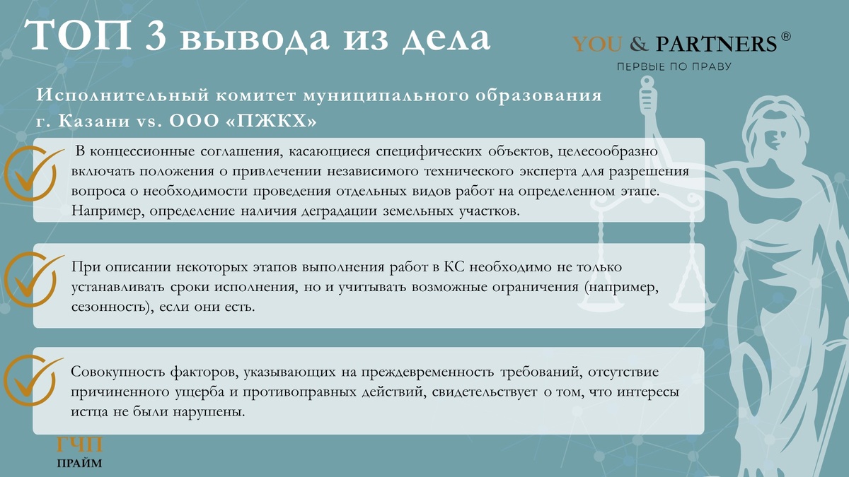 Команда You & Partners проанализировала решение суда по делу №А65-11464/2025. 📎 Суть спора: Исполнительный комитет муниципального образования г. Казани обратился в суд с требованием обязать ООО «ПЖКХ» провести рекультивацию полигона ТКО. Между истцом и ответчиком заключено КС в отношении реконструкции полигона ТБО путем строительства второй карты с обязанностью осуществлять деятельность по размещению, утилизации (захоронению) отходов с территории г. Казани. Позиция концедента: 🔘 Необходимо немедленно начать работы по рекультивации. В адрес концессионера направлена претензия с требованием приступить к рекультивации до 1 апреля 2025 года и закрыть полигон в связи с наличием экологических рисков. Позиция концессионера: 🔘 Требования концедента преждевременны, учитывая поэтапный характер работ рекультивации, а также непригодные погодные условия для проведения рекультивации на момент направления требования. Арбитражный суд республики Татарстан согласился с позицией концессионера и отказал