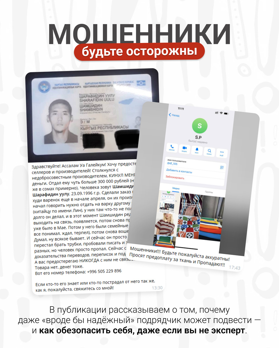 😟 "А нас обманули на целую партию…" 😥 "Отдали аванс — и нас просто заблокировали." 😮 "Заказали образцы, а в итоге в партии — швы кривые, ткань не та." К сожалению, такие истории — не редкость в швейной сфере (как и в любой другой). Мы регулярно читаем подобные сообщения в профессиональных телеграм-каналах и получаем откровения от некоторых клиентов, которых уже однажды обманули. И если вы думаете: «Ну со мной-то такого не случится…» — как раз для вас этот пост. 🎁 Для тех, кто дочитает до конца, мы приготовили полезный подарок 😉 Ранее мы уже мы уже поднимали тему важности личного контакта с производством — когда вы можете сами увидеть, где и как создаётся одежда. Во второй публикации на эту тему — подробно разобрали типичные признаки мошенников и красные флаги, на которые стоит обратить внимание. А теперь поговорим о том, почему даже "вроде бы надёжный" подрядчик может подвести — и как обезопасить себя, даже если вы не эксперт. ❌ Менеджер звучит уверенно, но швей ни разу не видели.