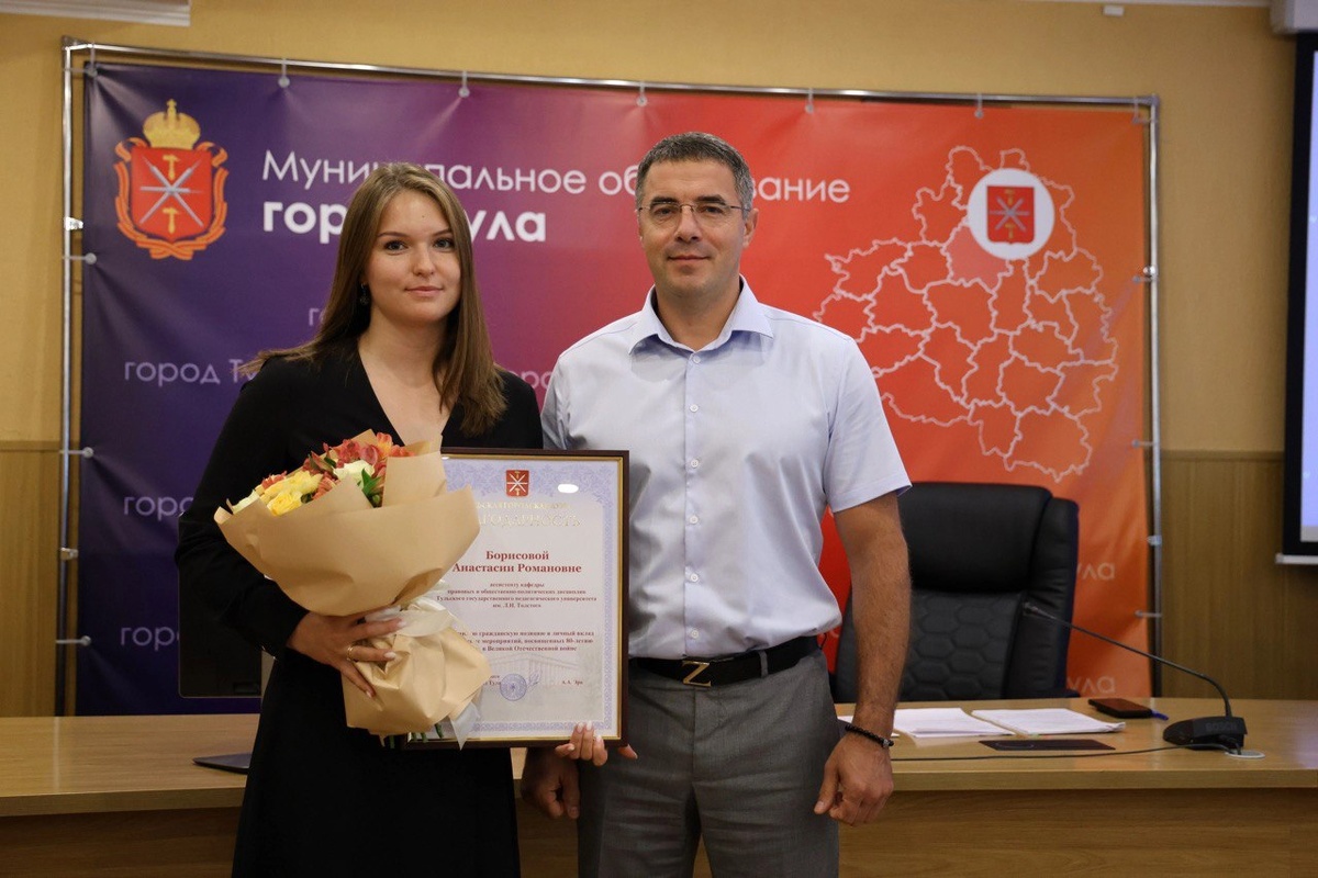 Ассистенту кафедры правовых и общественно-политических дисциплин Университета Льва Толстого Анастасии Борисовой была вручена благодарность Тульской городской Думы за активную гражданскую позицию и личный вклад в проведение мероприятий, посвященных 80-летию Победы в Великой Отечественной войне ✌️ Благодарность вручил глава муниципального образования город Тула Алексей Алоисович Эрк. 💫 Поздравляем Анастасию и желаем дальнейших успехов! #УниверситетЛьваТолстого