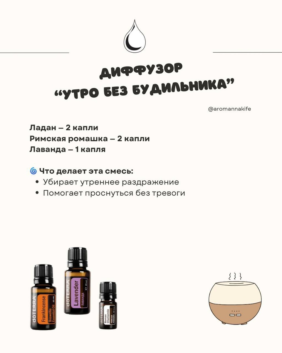 Мягкое включение Смесь в диффузор: 😘“Утро без будильника” • Ладан — 2 капли • Римская ромашка — 2 капли • Лаванда — 1 капля → Убирает утреннее раздражение, помогает проснуться с телом, а не с тревогой 😘Практика: ❌Не бери телефон в течение 20 минут после пробуждения. Вместо этого — роллер на шею, 3 вдоха с ладоней и чашка воды с лимоном. Дай себе шанс не “стартовать сразу же с тревоги”. Лайфхак: 📌Добавь 1 каплю римской ромашки в нейтральный крем и нанести на живот — особенно полезно вовремя ПМС.