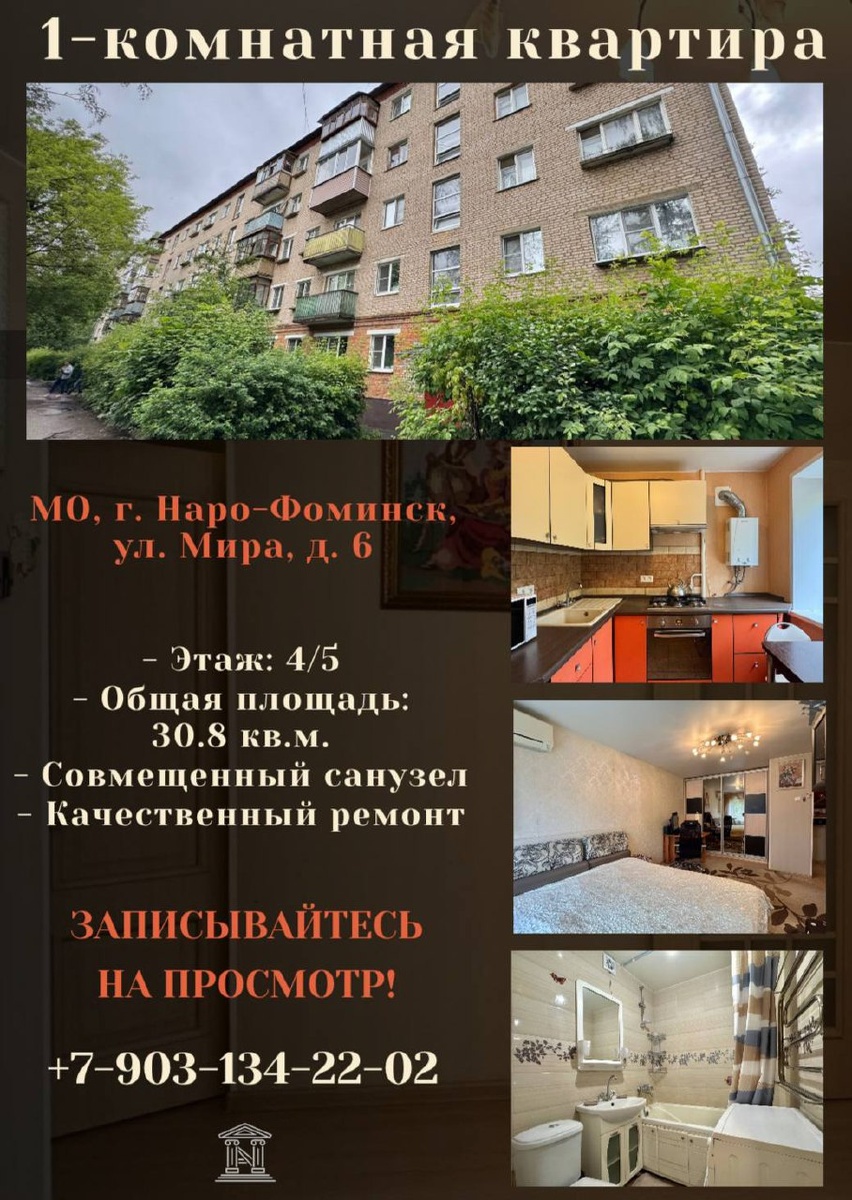 ПРОДАНО! Друзья, у нас новый объект! 💥 Однокомнатная квартира с ремонтом в тихом районе! Адрес: МО, г. Наро-Фоминск, ул. Мира, д. 6 Цена: 4 300 000 р. О квартире: 🎞️Этаж: 4/5 🎞️Общая площадь: 30.8 кв.м. 🎞️Совмещенный санузел 🎞️Качественный ремонт Квартира расположена в тихом и спокойном районе с развитой инфраструктурой: школы, детские сады, торговые центры, администрация города и банки — всё в 2-5 минутах пешком. Один собственник. Подходит под ипотеку. 📹 Видеообзор: Смотреть здесь Более подробная информация: Ссылка на объект 📞 Звоните и записывайтесь на просмотр: +7 (903) 134-22-02 #Объекты_Могутнова