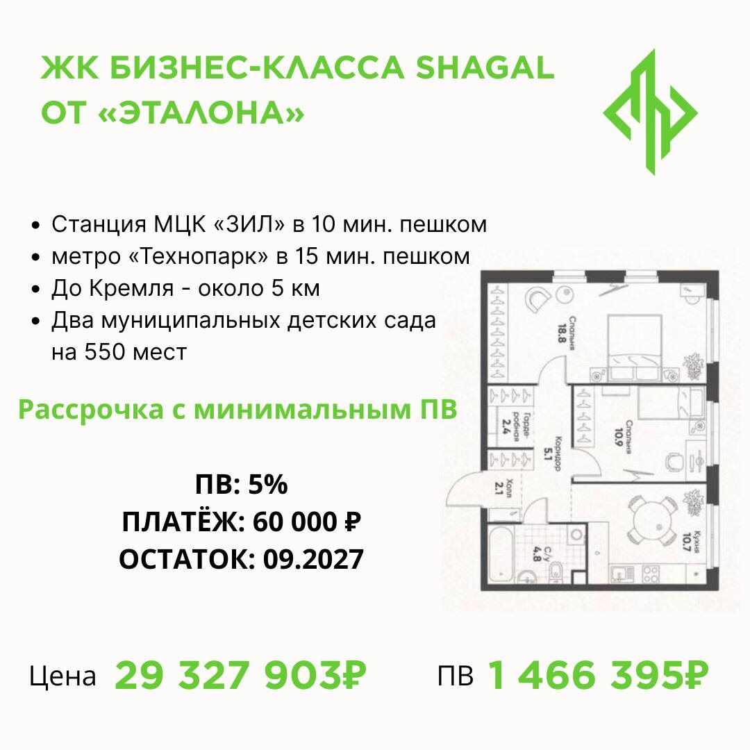 🌤Уникальные условия рассрочки на ЖК бизнес-класса– крупнейший градостроительный проект Европы - ЖК Шагал! 🟢Станция МЦК «ЗИЛ» в 10 мин. пешком, метро «Технопарк» в 15 мин. пешком. 🟢Благоустроенная закрытая территория с парками, ландшафтным дизайном и водоемами. 🟢Крупнейший в России инновационный образовательный центр на 2500 мест. 🟢Недалеко два муниципальных детских сада на 550 мест. 🟢Рядом рейтинговая 548 школа и Набережная Марка Шагала. 🔐Рассрочка с минимальным первоначальным взносом ПВ – 5% Эталон может себе такое позволить ➡️Стоимость 29 327 903 ₽ ➡️Первоначальный взнос 1 466 395,15 ₽ Ежемесячные платежи 60 000₽ Остаток 09.2027г. ➕Программы с возможностью перехода на ипотеку Срок сдачи: 2 квартал 2028г. Вы знали, что на все свои ЖК Эталон дает рассрочку и после сдачи дома в эксплуатацию? А программы ипотеки есть по 4% (Сбер семейная) и 14,99% стандартная ипотека (Совкомбанк)? Как перейти на ипотеку после рассрочки? Звоните! Расскажем!