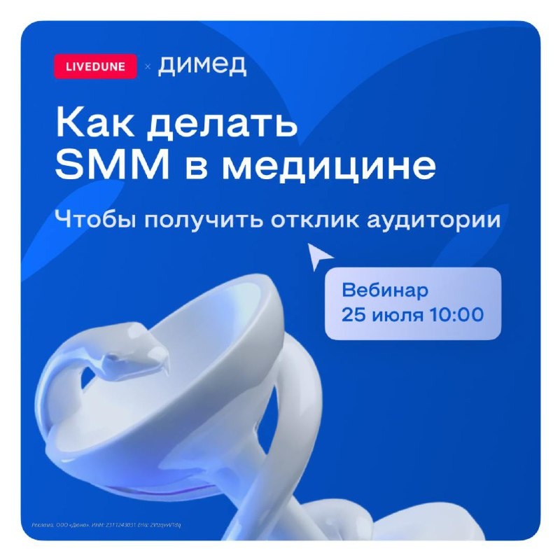 Как говорить о медицине интересно и понятно — бесплатный вебинар для маркетологов и SMM-специалистов. Медицинский контент может быть живым и интересным для широкой аудитории — главное, знать как его подать. Именно об этом будет вебинар «Как делать SMM в медицине, чтобы получить отклик аудитории», который организует LiveDune совместно с агентством медицинского маркетинга Димед. На вебинаре вы увидите практические кейсы и аналитику: 🔵Какие клиники входят в десятку лидеров по числу подписчиков; 🔵Где и как привлекать целевую аудиторию с помощью бигдата; 🔵Как говорить о медицине легко и без скучных формулировок; 🔵Какие форматы контента сейчас работают — ответ на основе цифр; 🔵Можно ли использовать тренды и ситуативный контент в медицинской тематике. Спикеры: — Гоар Салафаниди, руководитель агентства Диай х Димед; — Дарья Наземцева, директор направления спецпроектов и новых медиа в МЕДСИ; — Федор Жуков, амбассадор LiveDune и преподаватель по SMM в НИУ ВШЭ и РЭУ им. Г.В. Плеханов