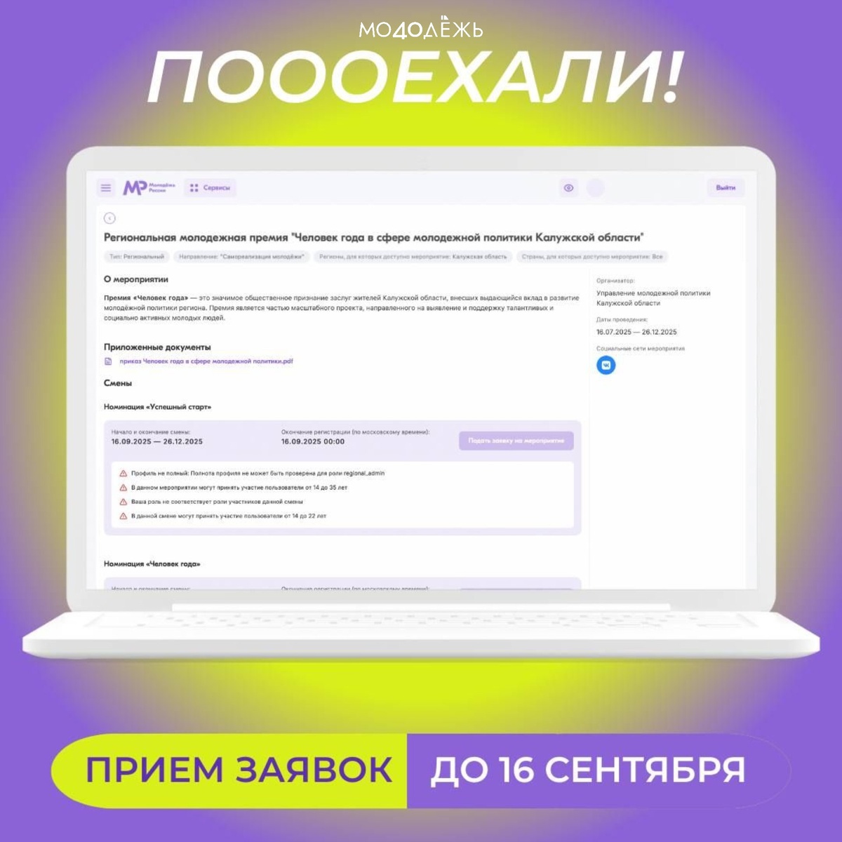#Молодёжь40 новость огооооооонь 🔥 Мечтаешь, чтобы о твоих достижениях узнал весь регион? Хочешь получить заслуженное признание за вклад в развитие молодёжной политики? Тогда это твой шанс! 🤩 Региональная молодёжная премия «Человек года в сфере молодёжной политики Калужской области» – это уникальная возможность заявить о себе, показать свои таланты, амбиции и, главное, сделать наш регион лучше и ярче! Ты можешь принять участие в следующих номинациях: ▫️ Амбассадор #Молодёжь40 ▫️ Доброволец года ▫️ Сообщество молодых ▫️ Наставник молодых ▫️ Человек года ▫️ Успешный старт ▫️ Событие года Глаза боятся, а руки уже заполняют заявку: https://myrosmol.ru/events/4bae09a6-464e-472d-8551-942113fb2e37 Регистрация продлится до 16 сентября 2025 года! Подробные условия участия в Премии ищите в положении 👇 Мероприятие реализуется в рамках национального проекта «Молодёжь и дети» при поддержке Президента России. #умп40 #Молодёжь40 #росмолодёжь #молодёжьидети #нацпроектмолодёжьидети