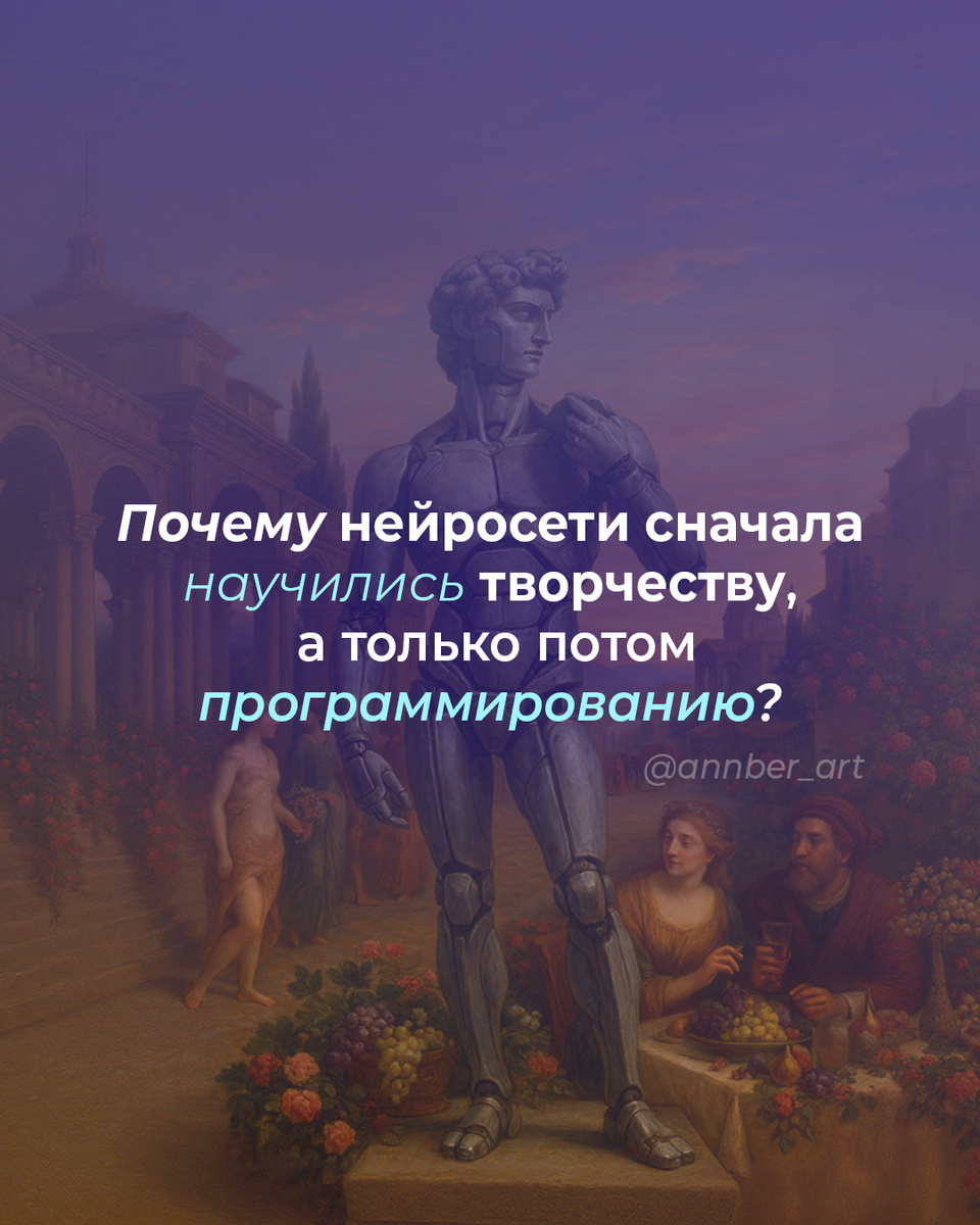 Почему нейросети сначала научились творчеству, а толькопотом программированию?