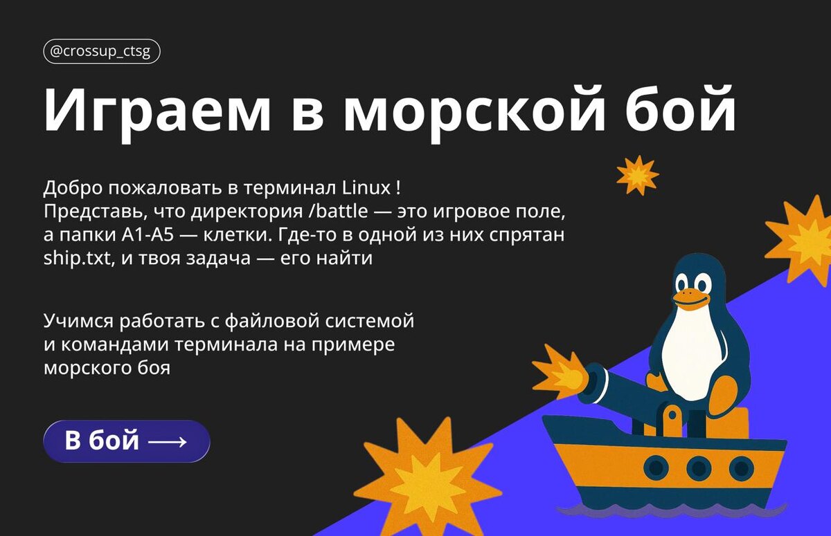 💥 Домашний бьюм Сегодня вместо тетрадки открываем терминал! Устраиваем баталии на полях Linux, играем в папках и учимся работать с файловой системой весело и с пользой 🕺 Смотри карточки и зови друга в морской бой 😐 🌟 CrossUp | Подписывайся! #войтивайти