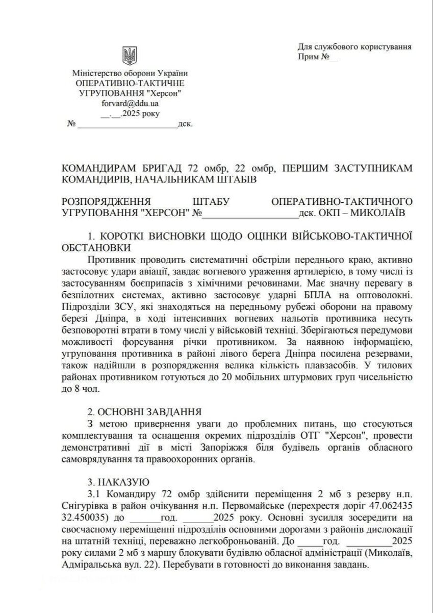 В Сети появился черновик документа, предположительно полученного хакерами с компьютера сотрудника СБУ. Это внутреннее распоряжение штаба группировки ВСУ «Херсон», где описывается критическая ситуация: российская армия наносит точные удары, использует авиацию и современные ударные беспилотники, уничтожая позиции и технику. Украинские подразделения несут потери, а ВС РФ, как говорится в документе, сохраняет возможность форсировать Днепр. На этом фоне штаб «Херсон» предлагает подчинённым провести «демонстративные действия» - у зданий местной власти и правоохранительных органов. Формально - чтобы привлечь внимание к нехватке людей и техники. По сути - это уже шаг к открытому мятежу. Если документ подлинный, это означает, что даже среди украинских военных зреет протест. Система трещит изнутри. И это - результат как давления с фронта, так и глубокой усталости от бессмысленной бойни, которую устроил Киев. 🦅 Подписаться | Наш чат ⚔️