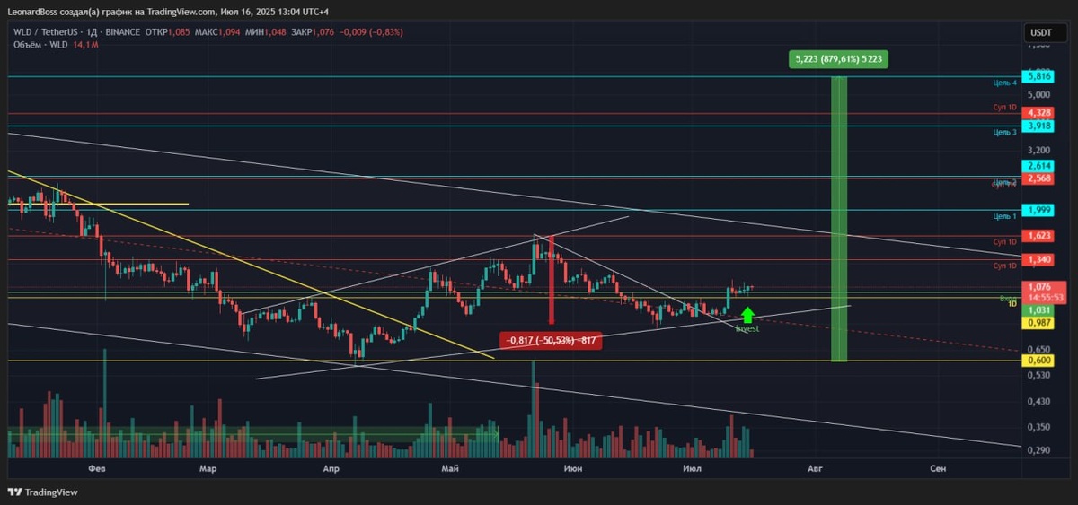 #инвест #WLD 🕯🕯🕯 ⚠️Сильнейший проект! Очень красиво собрал ликвидность после апрельского прыжка. Закрепился над круглым уровнем 1$. Можно также брать частями. Цели на графике минимальные, при булране я его вижу не меньше 15-20$. Если ETH поедет выше с текущих = этот актив устремится следом!! P.s. коллеги, если вы набираете инвест позы частями, ок, делите в пределах 20%го диапазона вниз на случай отката. Если заходите с текущих или на минимальном диапазоне = не игнорьте стопы. Поверьте, вам 5-7% стоп вы даже не заметите, когда зайдете на случившемся откате в -30% = проверено временем = подтверждено = работает на 100%. Будьте Smart и не дарите рынку свои деньги!!!