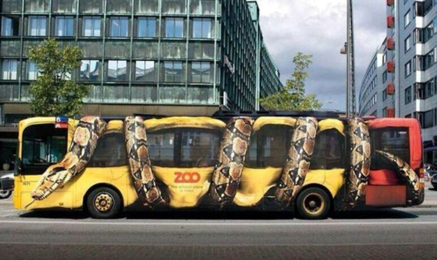 Поднимите руки, кто боится змей. А кто боится гигантских змей, которые сжали в свои кольца целый автобус? Я на таком точно бы не поехала. Если что, это они так в зоопарк зазывают)