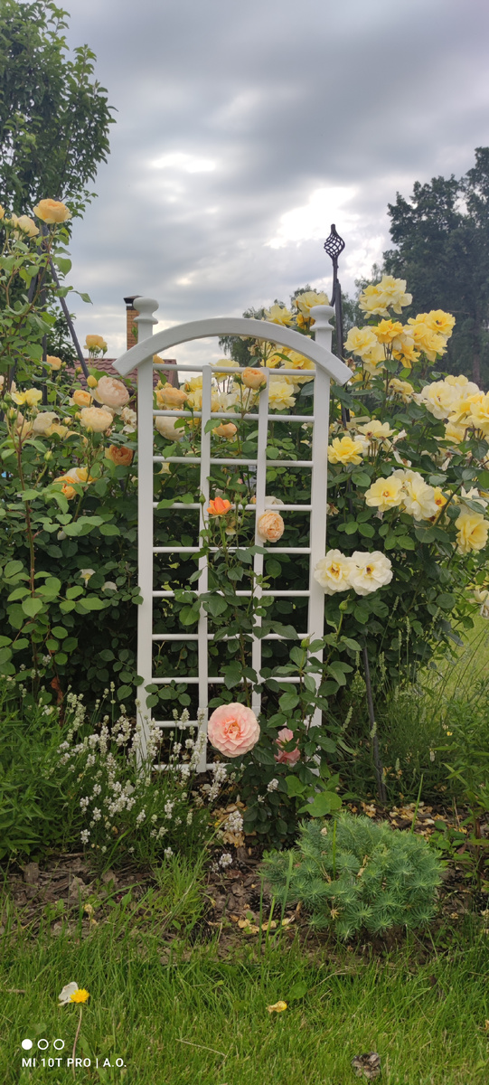 После того как я сделала садовую скамеечку из детской кроватки у меня осталась запчасть одна секция от ограждения кроватки. Лежала она без дела. И я решила ее пристроить. Решила сделать перголу. Нашла рейки, какую то деревяшку изогнутую, уже никто и не помнил от чего она, а на навершие решила приспособить старые дверные ручки, которые валялись в подсобке. Все зашкурила, прикрепила рейки сначала на клей, а потом шурупами. Прикрепила ручки как навершие, чтобы пергола выглядела более завершенно. Все дырочки и неровности заделала герметиком для уличных работ белым. Зачистила и покрасила Акватекс сканди белый. Очень мне нравится как он держится на уличных деревянных вещах (это не реклама, а опыт в использовании материала). Прикрепила железные ножки, чтобы легко втыкать в землю, и чтобы пергола была мобильной. Вот такая пергола получилась из того, что осталось, из того что пособирала по сусекам) Результатом я довольна. Пока английского огородика у меня нет, но уже есть пергола для него. При