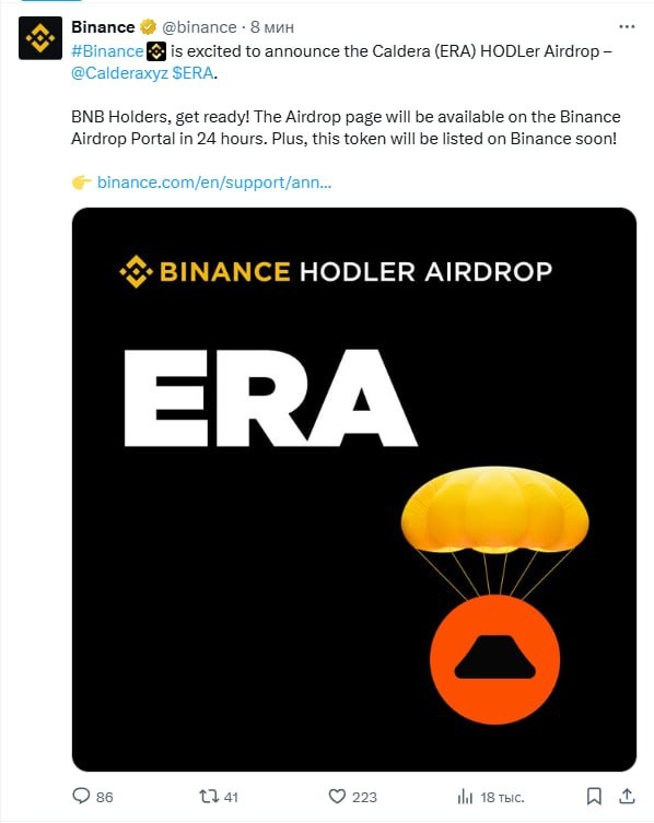🔸Binance запустила новый airdrop для проекта Caldera (ERA