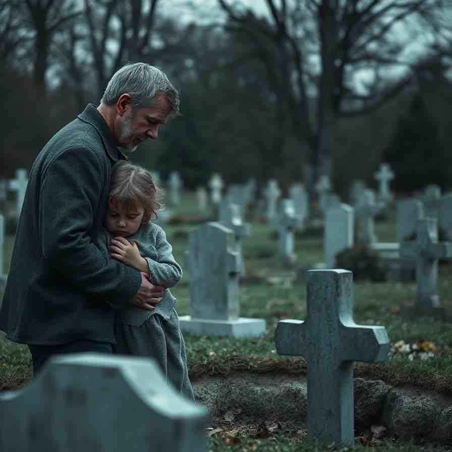 На кладбище, где тёплые лучи солнца едва пробивались сквозь облака, он медленно приближался к могиле своего единственного сына. С каждым шагом его сердце наполнялось растерянностью и горечью утраты. Годы, проведённые вместе, воспоминания о смехе и радости, всё это казалось слишком далеким, словно это было не с ним. Когда он наконец остановился перед мраморным памятником, его взгляд упал на девочку, сидящую среди зелёной травы. Она была совсем маленькой и, казалось, потерялась в своих эмоциях. С слезами на щеках она прижимала к груди букет полевых цветов, словно они были единственной нитью, связывающей её с умершим. Он медленно наклонился, чтобы рассмотреть её ближе. Малышка тихо всхлипывала, её маленькие плечи сотрясались от горя. Вопросы застыли в его горле — кто эта девочка? Как она может знать о его сыне? Девочка подняла голову, и их взгляды встретились. В её глазах была не только печаль, но и глубокая привязанность. «Я скучаю по нему», — произнесла она, и эти слова, полные не