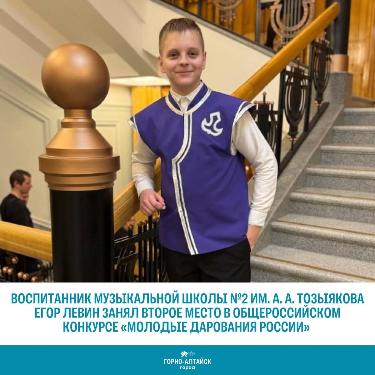 Воспитанник музыкальной школы №2 им. А. А. Тозыякова Егор Левин занял второе место в общероссийском конкурсе «Молодые дарования России» Конкурс — это всероссийская юношеская олимпиада с международным участием, которая состоялась в Москве. Учредитель конкурса — Академическое музыкальное училище при Московской государственной консерватории П.И. Чайковского. Среди участников — воспитанник музыкальной школы №2 им. А. А. Тозыякова Егор Левин в номинации «Народные и национальные инструменты», его преподаватель - Инна Фастовская. Инф. Администрация г. Горно-Алтайска