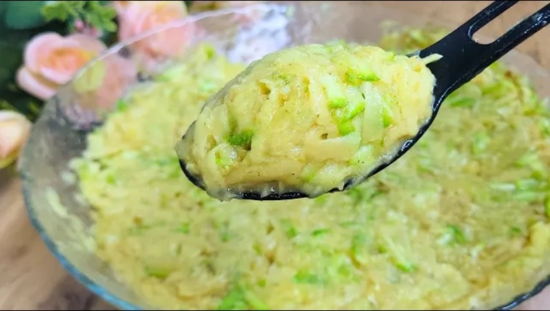 Кабачок, картофель и лук натрите на средней или мелкой терке. Если кабачок очень сочный — слегка присолите, оставьте на 5 минут, затем отожмите лишний сок. Также, отожмите сок с картофеля (присаливать не нужно). - Смешивание: