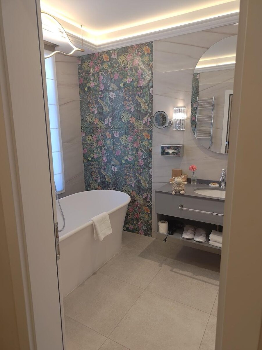 Ванная в люксе 206 — это отдельный эстетический аттракцион. Много света, свободное пространство, большая отдельно стоящая ванна и душ с тропическим режимом — всё выглядит свежо и продуманно. Особенно хороша акцентная стена с цветочным орнаментом — визуально вытягивает пространство и добавляет настроения. Подсветка мягкая, зеркала не искажают, светильники симпатичные. Косметика та же, что и в других номерах. Сверху — дизайнерская люстра с изгибом, напоминающим водную рябь. Из полезного: полотенца с монограммой, весы, фен, полноразмерное зеркало и полки, куда всё действительно помещается. Минимализм с вниманием к деталям. #петровка26