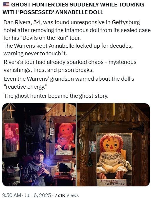 Одержимая дьяволом кукла наносит новый удар. С такими заголовками вышла сегодня американская пресса. В принципе, даже почти не преувеличили. Накануне при невыясненных обстоятельствах в гостиничном номере в городе Геттисберг погиб 54-летний «охотник за привидениями» и исследователь паранормальных явлений Дэн Ривера. Любитель таинственного - Ривера как раз проводил авторский тур «Бесы в бегах», в рамках которого за деньги водил людей по "страшным местам" американских городов. Изюминкой "экскурсии ужасов" была недавно приобретенная Риверой кукла Аннабель. Аннабель – героиня одной из самых популярных в Америке городских страшилок, по которой снято немало одноименных американских же ужастиков. Согласно городской легенде, в 1970-х эту куклу одной студентке подарила ее мать, купившая ее в комиссионке. Якобы ее прежней хозяйкой была погибшая 7-летняя девочка Аннабель (отсюда и имя куклы). Тряпичная Аннабель начала творить в общаге разные нехорошие вещи – двигала предметы, летала сама и т.д