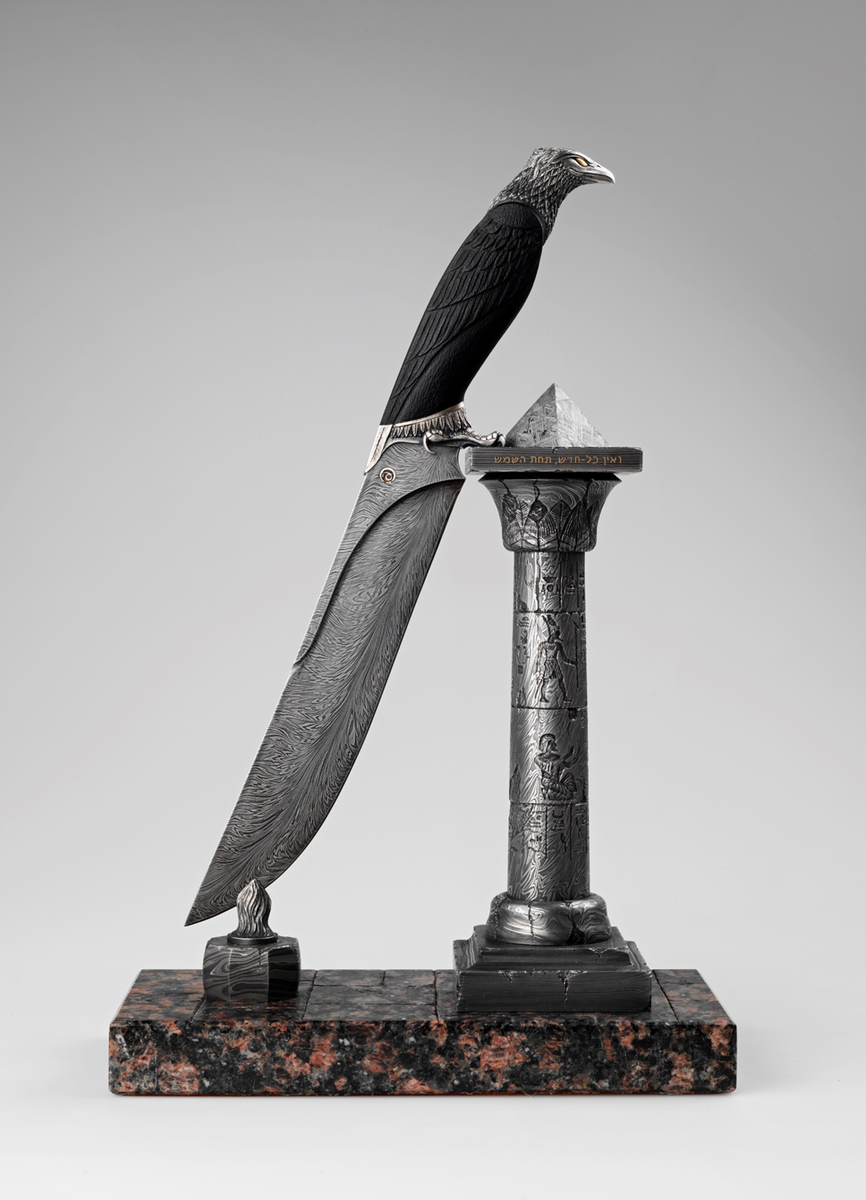 Композиция изображает храм Феникса в Гелиополе, в Египте. Столб из дамаска с уникальной структурой покрыт глубокой гравировкой, на нем горизонтальная площадка из другого дамаска, с другим составом и структурой, на которой нанесена золотая надпись на древнем варианте иврита - для точности пришлось обращаться в Академию иврита в Израиле.
