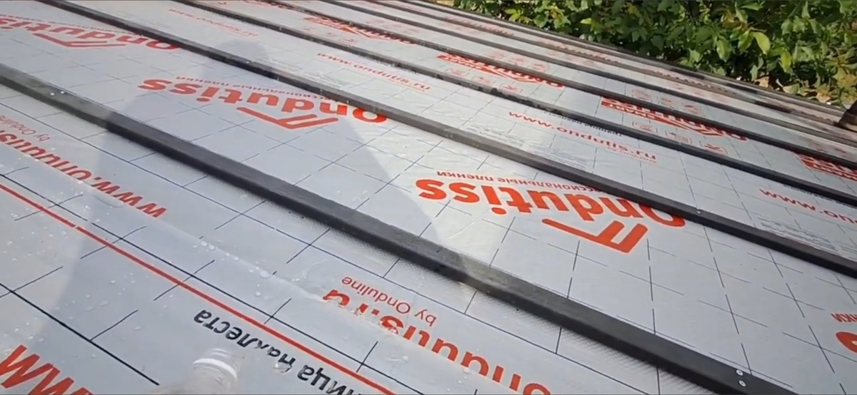Тема: Эксперимент с навесом и пленкой. Описание: В этой статье я расскажу как провел эксперимент, чтобы проверить, как вода будет стекать с навеса, сделанного с использованием пленки поверх ферм и прогонов без контробрешетки. Многие зрители выражали опасения, что вода будет застаиваться на прогонах, что может привести к проблемам. Я решил проверить это на практике. Основные моменты: 1. Конструкция навеса: Пленка натянута прямо поверх ферм, а затем идут прогоны без контробрешетки. Это сделано для предотвращения капания конденсата вниз при перепадах температуры. 2. Эксперимент: я лью воду сверху на навес, чтобы продемонстрировать, как она будет стекать. Я уверен, что вода будет утекать вниз без проблем. Так и произошло, вода без препятственно стекла вниз под прогономи. И не каких луж не образовалось. 3. Металлические прогоны: я объяснял, что металлические прогоны не боятся перепадов температуры и не гниют, так как они окрашены, поэтому вода, которая может на них попадать, не вызов