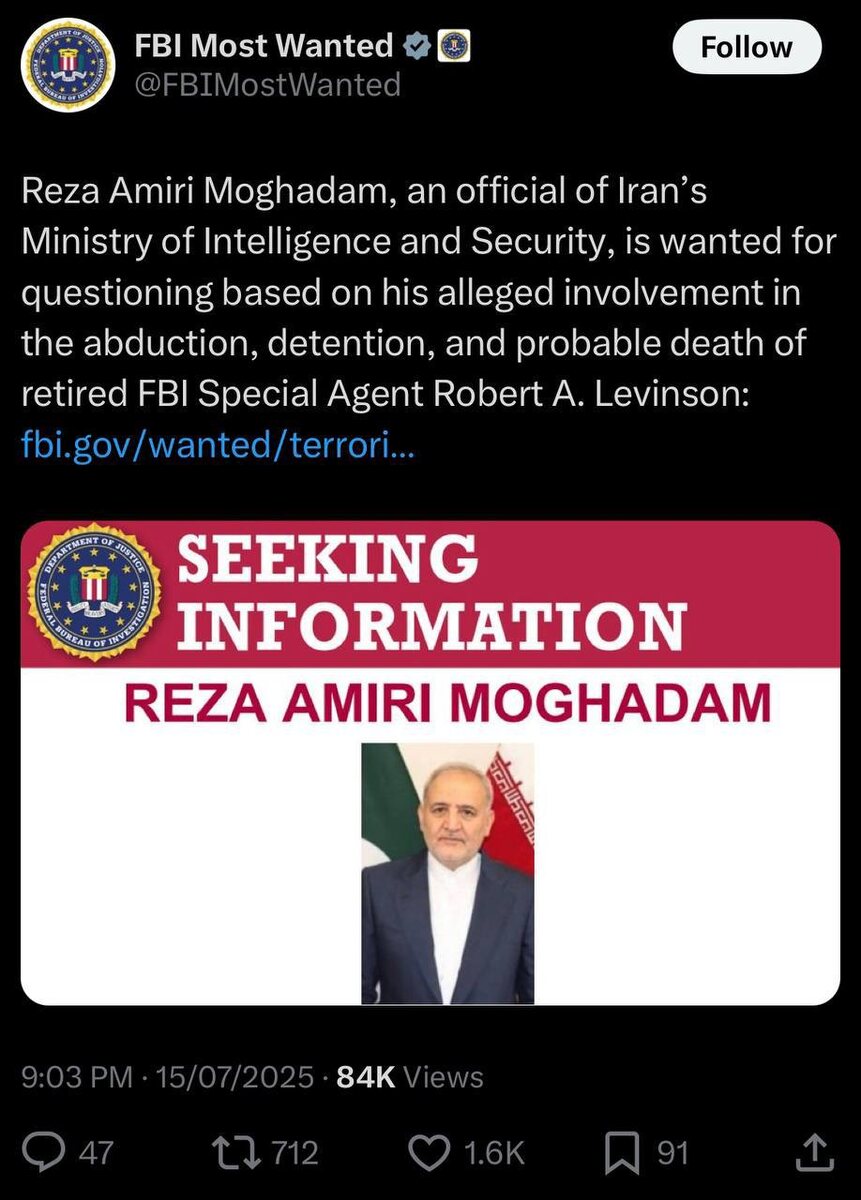 Посол Ирана в Пакистане был включен в список самых разыскиваемых ФБР. Он заявлен в качестве сотрудника разведки, а не чиновника министерства иностранных дел.