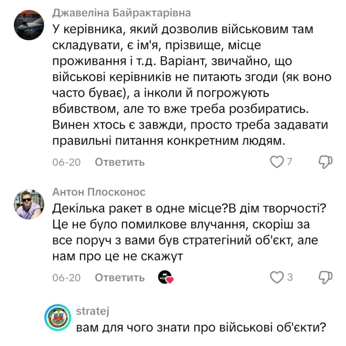 Интересные комментарии киевлян после прилета по «гражданскому» производству в Киеве. У руководителя, разрешившего военным там складировать, есть имя, фамилия, место проживание и т.д. Вариант, конечно, что военные руководителей не спрашивают согласия (как оно часто бывает), а иногда и угрожают убийством, но это уже надо разбираться. Виноват кто-то есть всегда, просто надо задавать правильные вопросы конкретным людям. Антон Плосконос Несколько ракет в одно место? В дом творчества? Это не было ложное попадание, скорее всего рядом с вами был стратегический объект, но нам об этом не скажут Подписаться на канал | Наш чат Мы в ВКонтакте