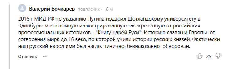 Живешь себе спокойно, ни о чем таком не подозреваешь. И вдруг в комментарии приходит человек, который сообщает совершенно потрясающие сведения. Причем сообщает так уверенно, безапелляционно. И сразу диагноз власти выносит. И кучу лайков на этом собирает. В общем, мы обнаружили у себя на канале крайне любопытный комментарий. Вот он: Если вам не видно, мы сразу текстом процитируем: "2016 г МИД РФ по указанию Путина подарил Шотландскому университету в Эдинбурге многотомную иллюстрированную засекреченную от российских профессиональных историков - "Книгу царей Руси": Историю славян и Европы от сотворения мира до 16 века, по которой учили истории русских князей. Фактически наш русский народ ими был нагло, цинично, безнаказанно обворован". Давайте на секунду поверим этому гражданину и представим себе ситуацию. Была, оказывается, у нас в России многотомная иллюстрированная "Книга для царей". В этой книге изложена история славян и Европы от сотворения мира. Подразумевается, что вот от самого со