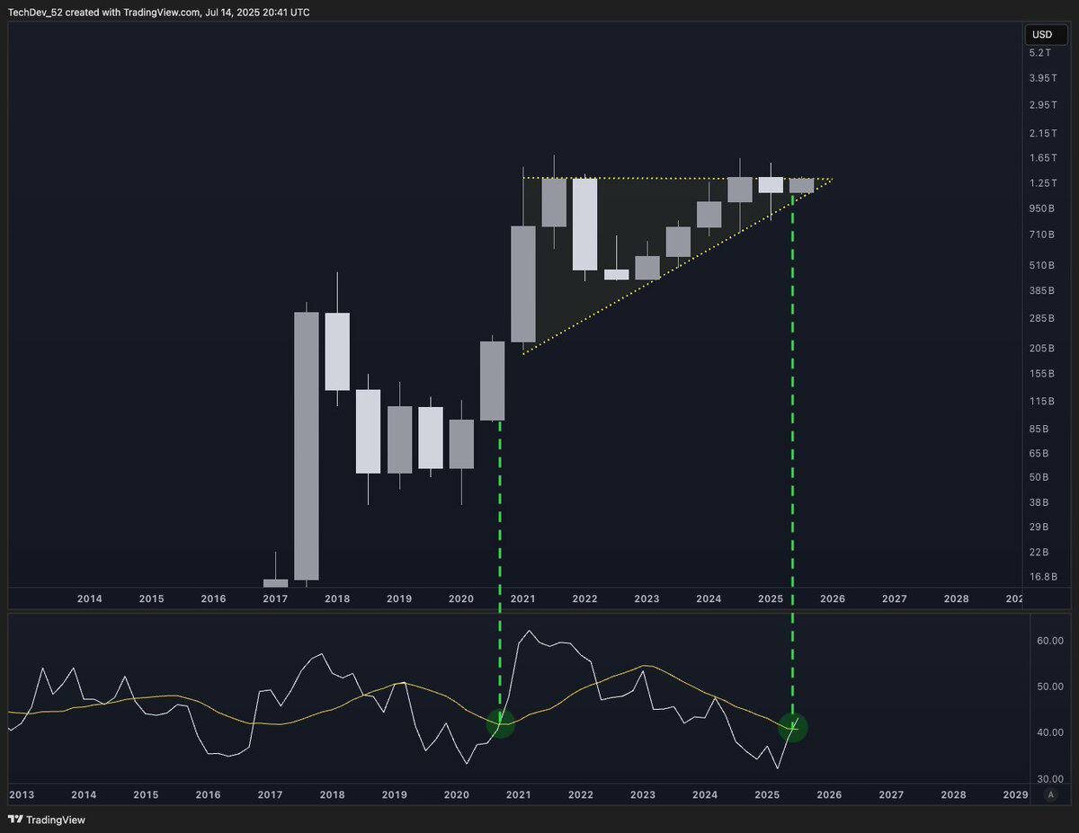 4 года сжатия. Что будет, когда альты отпустит? Смотрите внимательно. На графике — капитализация альткоинов (без биткоина и эфира), месячный таймфрейм. С 2021 года — медленное сужение, консолидация в треугольнике. Ни вверх, ни вниз. Просто давление. 4 года. И вот что интересно: RSI как в 2020, и формация — почти копия той, что была перед импульсом 2021. Если история хоть немного рифмуется — мы стоим на пороге взрывной разрядки. А теперь к самому важному: вы готовы к альтсезону, если он правда начнётся? Потому что: — поезда уходят быстро — FOMO приходит сразу после — ошибки совершаются в первые 10 дней Если хотите — сделаю пост с логикой, как действовать, если начнётся настоящая волна: где искать входы, как не перегреться, какие графики выглядят сильнее других. Пишите «альты» или ставьте 🔥 — соберу подборку. #альты #рынок #графики #техника #инвестиции