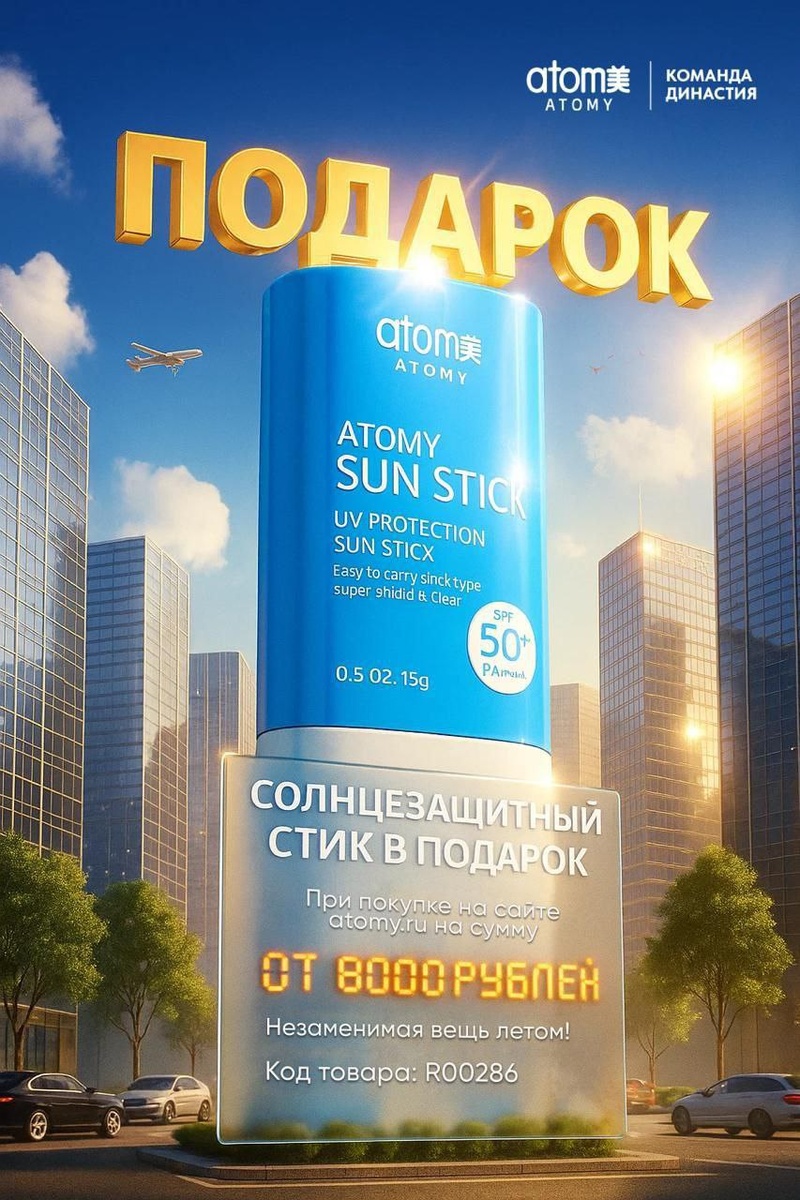 😌☺️😌😌😍❗️🥰💙🔥 ТОЛЬКО 24 ЧАСА! 🎁 Подарок за покупку! Atomy дарит СОЛНЦЕЗАЩИТНЫЙ СТИК! Условия простые как дважды два: Покупаете на 8000+ рублей Получаете стик в ПОДАРОК 🎁 Когда? С 09:00 16 июля до 09:00 17 июля Что за чудо-стик такой? SPF 50+ (максимальная защита!) ☀️ МОЖНО НАНОСИТЬ ПОВЕРХ МАКИЯЖА! Представьте: накрасились утром. В обед вышли на солнце. Достали стик - провели по лицу - защита обновлена! 🤩 Руки чистые. Макияж на месте. Вы - красотка под защитой! Теперь не надо прятаться от солнца! Едете на дачу? Стик в сумочку! Гуляете с внуками? Обновили защиту за секунду! На пляж? Не забудьте про лицо!