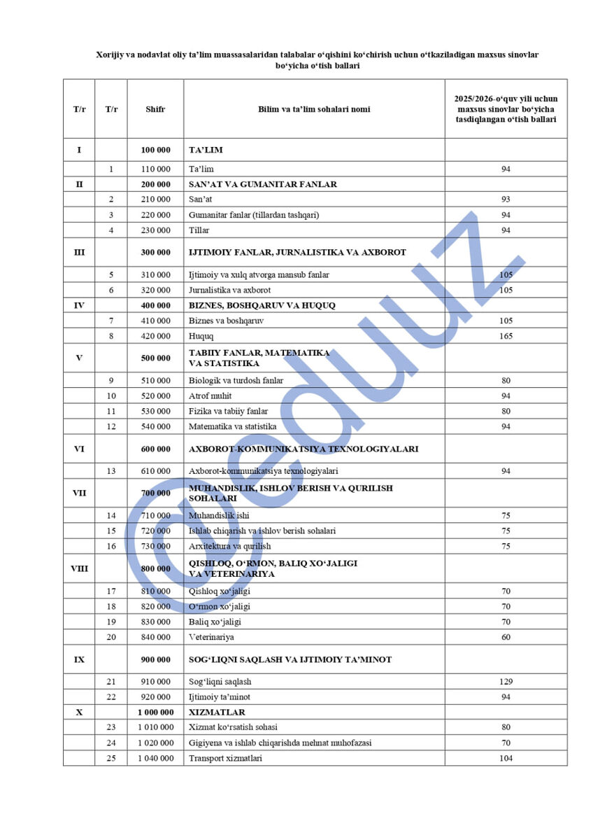 Олий таълим, фан ва инновациялар вазирининг тегишли буйруғи билан 2025/2026-ўқув йили учун хорижий ва нодавлат олий таълим муассасаларидан талабалар ўқишини республика давлат олий таълим муассасаларига кўчириш бўйича ўтказиладиган махсус синовлар бўйича ўтиш баллари тасдиқланди.