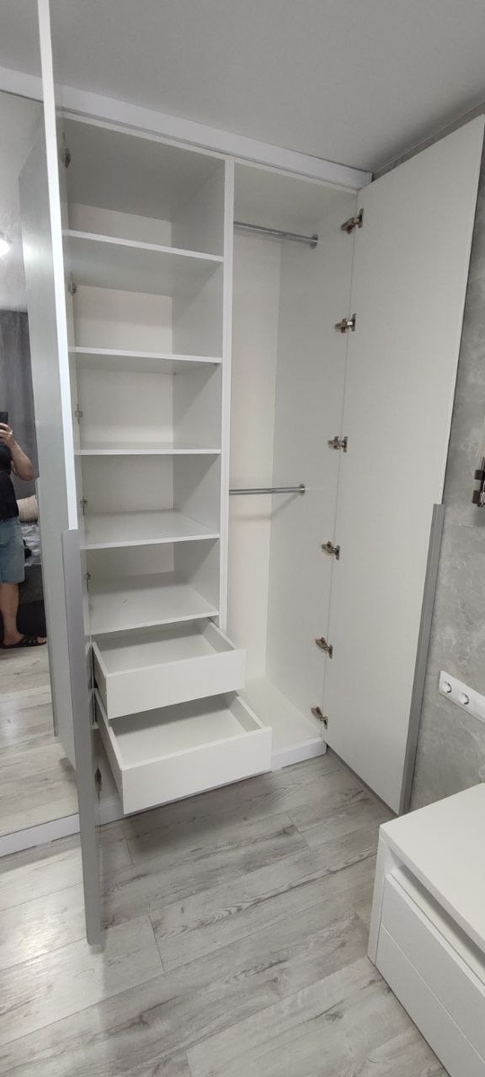 Доброго дня дорогие друзья! Снова удачный проект. Небольшой шкаф для спальни, в не стареющем белом цвете. Так как клиенты люди увлекающиеся чтением слева предусмотрели книжную полку на всю высоту шкафа. Решение необычное, но в какой-то степени правильное. Не придется протирать пыль на открытых книжных полках. Ну и зеркала также добавляют шика и глубины изделию. И в комплекте снова необычные прикроватные тумбочки😊😊