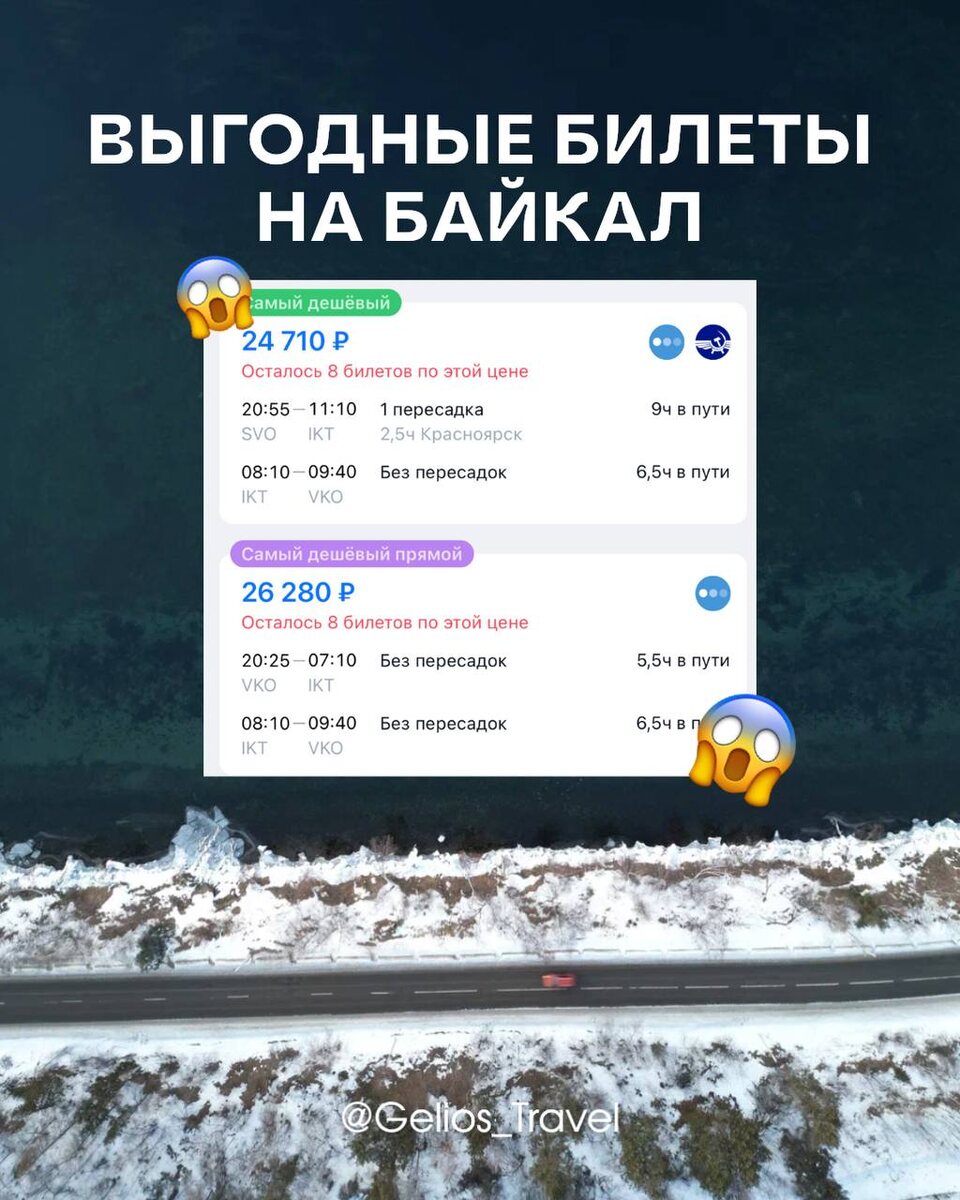 ‼️ Билеты на Байкал по очень выгодным ценам ‼️ даже в Новый Год! Обычная стоимость туда-обратно 45-50.000₽, в пик может достигать 60.000₽😱 Сейчас на все наши зимние, весенние даты стоимость 24-28.000₽ туда-обратно ✈️ Если планируете путешествие на Байкал этой зимой - рекомендуем брать билеты прямо сейчас) ✍🏻 Напишите в комментариях «Байкал» - отправим программу и поможем выбрать билеты)