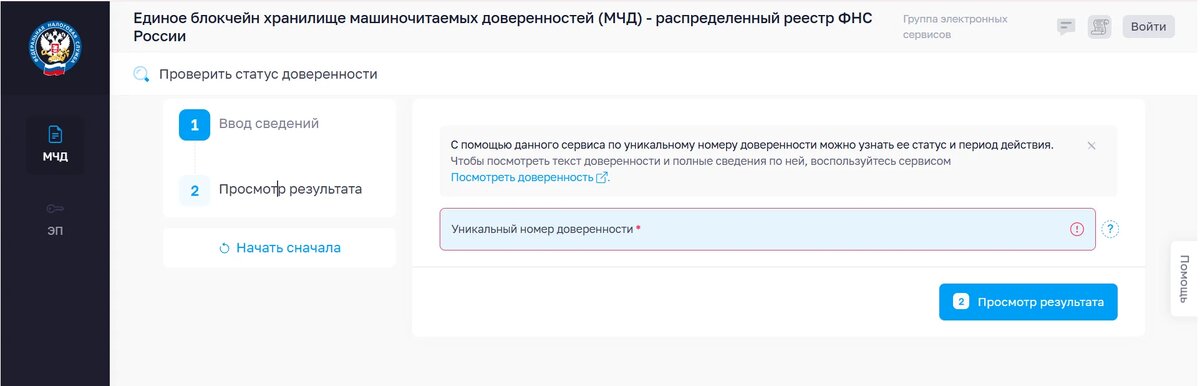 - Убедитесь, что номер МЧД и ИНН введены без ошибок.