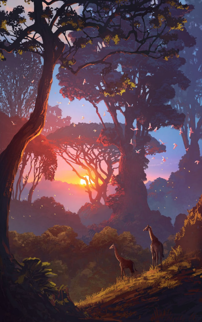 Картина переносит зрителя в волшебный, почти сказочный лесной пейзаж, залитый мягким светом заходящего солнца. В центре композиции — два жирафа, взрослый и детёныш, замершие на освещённом склоне, окружённые густыми деревьями с разлапистыми кронами. Свет солнца пробивается сквозь ветви, окрашивая листву в тёплые оттенки розового, пурпурного и золотого. Атмосфера наполнена покоем и благоговением перед природой. Художник мастерски использует свет и тень для создания глубины и драматического эффекта, а также подчёркивает хрупкую красоту жизни в дикой природе. Картина вызывает ощущение магии, уединения и тихого восхищения. Стили: Фэнтези-арт, цифровая живопись, неоромантизм, символизм, реализм, иллюстрация. Автор работы: Сильвен Саррайль, Тулуза, Франция Картина «Жираф» Здесь вы можете наслаждаться картинами современных цифровых художников, которых нет в масс-маркете, и которые можно купить на холсте или бумаге 🤍