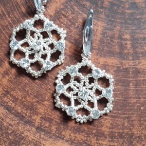 Круглые серьги цветы легкие, воздушные, кружевные, отлично смотрятся на ушке. Шатоны добавляют блеска. Процесс плетения: https://youtu.be/G6Yu_o7mGjw и https://rutube.ru/video/4ed0774daf79c1437b68101f0a2f28d4/ Материалы: бисер 15/0, мононить, шатоны 4 мм., игла Набрать 6 бисерин, завязать узелок, провести нить в соседнюю бисерину Далее набрать 7 бисерин, провести нить в бисерниу из которой выходит нить и в следующую бисерину на кольце Теперь набрать 6 бисерин, провести нить через бисерину предыдущего кольца, бисерину из которой выходит нить и следующую бисерину на кольце. Таким образом проплести по кругу При плетении заключительного кольца нить вывести из первой бисерины первого кольца этого ряда Набрать 5 бисерин, нить вывести из бисерины центрального кольца Закрепить шатон Вывести нить из центральной бисерины ближайшего лепестка Набрать 3 бисерины, шатон за уголок, 3 бисерины, провести нить через центральную бисерину следующего лепестка Так выглядит вид сзади Проплести по кругу Вид
