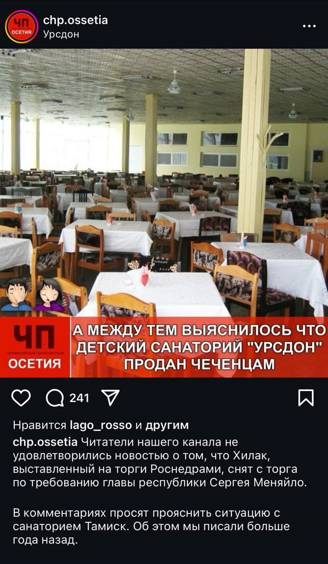 «Курорты Осетии» опровергли распространившуюся в соцсетях информацию о продаже детского санатория «Урсдон» неким «чеченцам» В связи с распространением в социальных сетях информации о продаже детского лагеря «Урсдон» в частные руки, администрация пансионата «Урсдон», официально заявляет: Пансионат «Урсдон», на базе которого ежегодно функционирует детский оздоровительный лагерь «Урсдон», был и остается филиалом ООО СКО «Курорты Осетии» и не был продан частным лицам. Учреждение продолжает работать в штатном режиме, обеспечивая полноценный отдых и оздоровление детей и взрослых. Просим жителей Республики, а также родителей детей, находящихся в лагере, не доверять неподтверждённым данным и руководствоваться исключительно официальной информацией. С уважением, Директор ООО СКО «Курорты Осетии» Хугаев Батраж Павлович