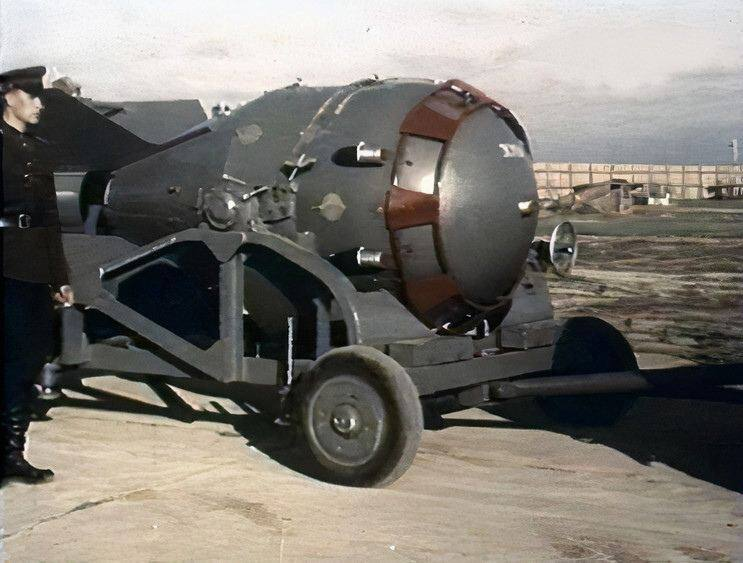 Советская атомная бомба РДС-2 в сопровождении офицеров КГБ буксируется к носителю Ту-4, 1954 год.