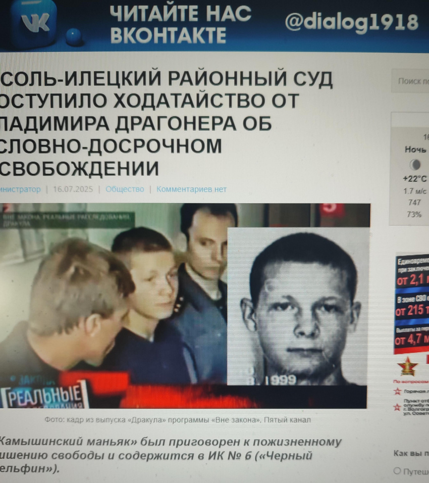 Административная газета "Диалог" подхватила серию публикаций в разных СМИ о камышинском маньяке, который запросился на свободу. Вот что написала газета чиновников Камышина сегодня, 16 июля. «Камышинский маньяк» был приговорен к пожизненному лишению свободы и содержится в ИК № 6 («Черный дельфин»). Драгонер мотивировал тем, что с 2002 года он находится в колонии в Оренбургской области, получил специальность, полностью возместил моральный вред потерпевшим и сейчас пребывает в обычных условиях содержания. В случае положительного решения вопроса собирается ехать к матери в Камышин (он жил в девятиэтажке на ул. Базарова). Как известно, в 1999 году в Камышине Драгонер, в ту пору учащийся ПТУ № 14, совершил ряд зверских убийств, лишив жизни пять человек (трех девушек и двух парней). На слуху у всех убийства в районе понтонного моста. Судебно-психиатрическая экспертиза установила, что 18-летний убийца вменяем, расстройствами психики не страдал. В 2001 году ему вынесли приговор о пожизненном л