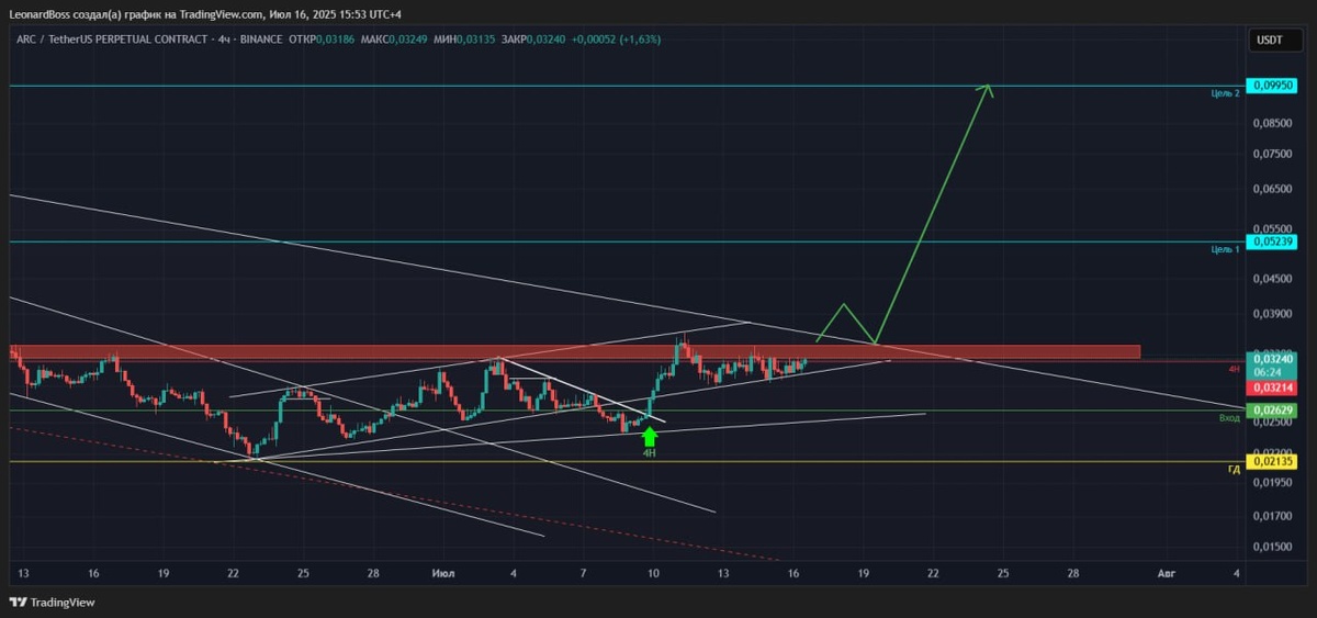 #ARC 🕯🕯🕯 ⚠️Проект из направления ИИ агентов, некоторые из которых уже показали десятки иксов. Данный актив также показывал ранее неплохой рост и уже бывал у 2й цели, но на мой взгляд в нем еще достаточно потенциала на ретест той самой зоны, а возможно и выше. Уж очень он сильно держится на последних качелях и достаточно красиво поджимает важный блок сопротивления!! P.s. вот тут коллеги, вам пригодятся уровни напоминалки, спешку в сторону. Нас ждут 2 варианта: либо он все же откатит от сопротивления со всем рынком и тогда мы его обязательно берем у уровня прежнего входа, либо цена продавит таки сопротивление и поедет дальше. Чуть левее уже была попытка пробить блок, хотя больше похоже именно на манипуляцию с ложным пробоем, что часто бывает незадолго до настоящего мощного движения. Одним словом ставим сверху + снизу напоминалку и спокойно ждем свою ТВХ!!!